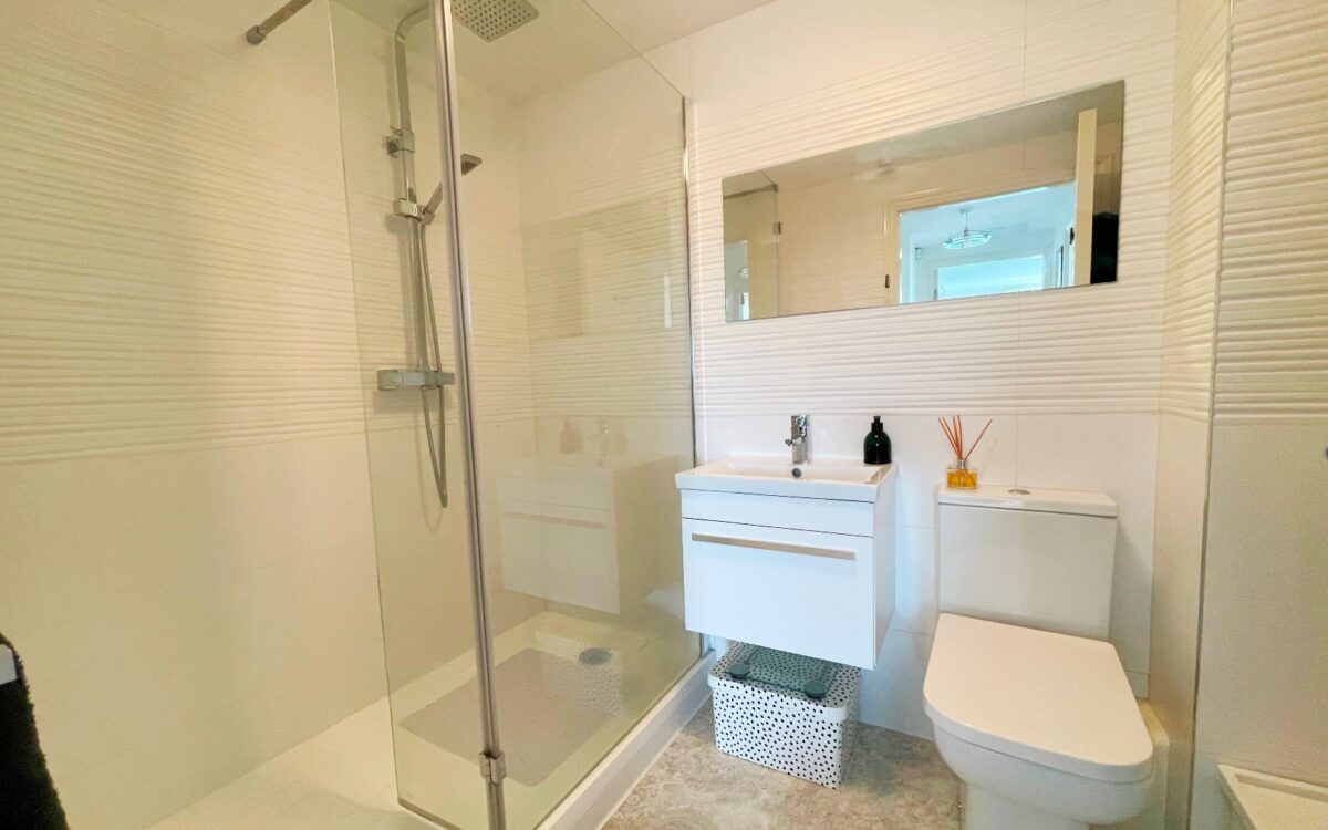 REFITTED BATHROOM: fully tiled walls, ‘floating’ vanity unit, low level WC, large walk-in shower with ‘rainfall’ head & diverter, vertical stainless steel towel radiator, large mirror & extractor fan.