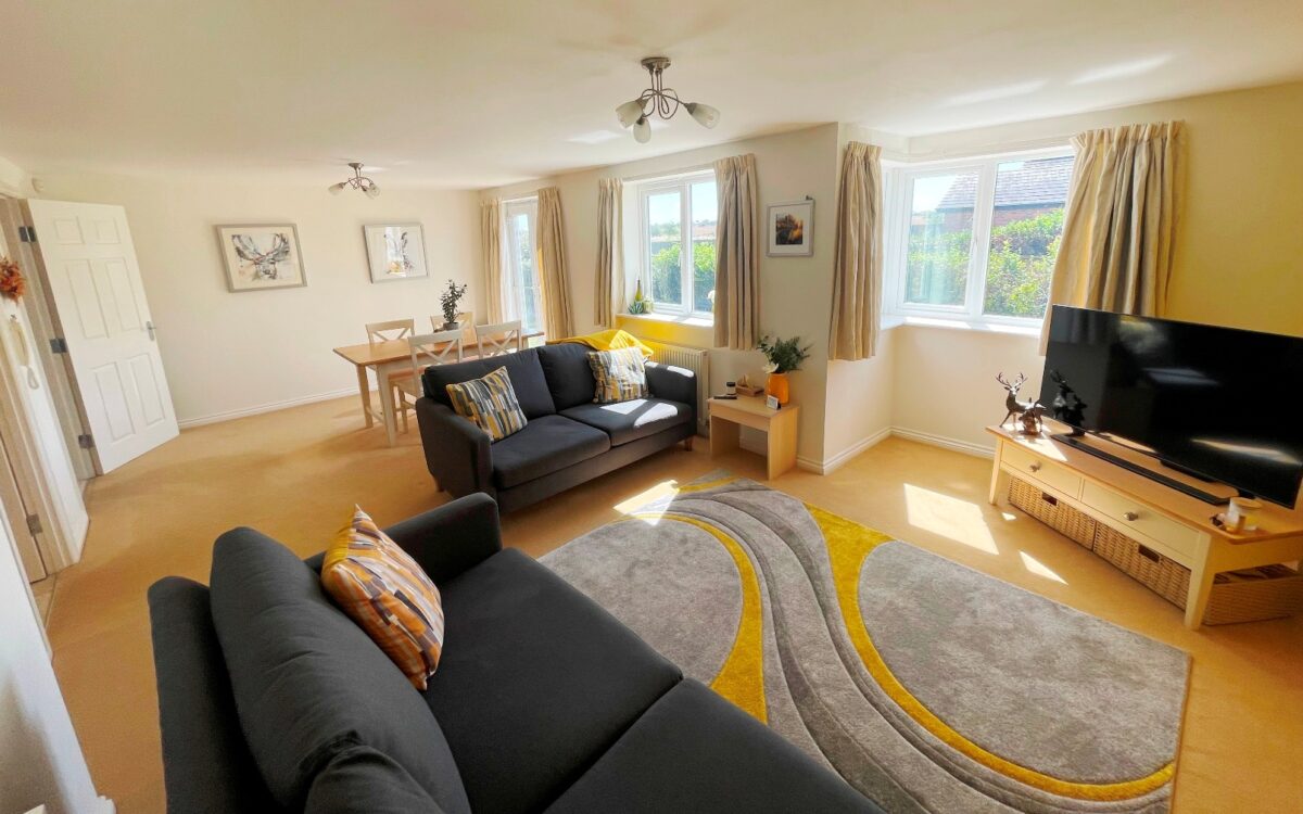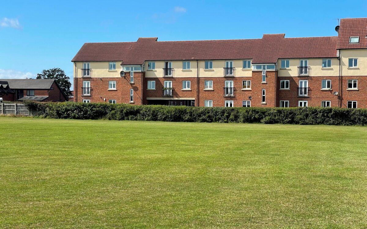 The spacious accommodation briefly comprises: On the ground floor: communal lobby, Apartment No. 28: hall with fitted cloaks cupboard, superb L-shaped living room (22′ 6″ – 6.86m) with uPVC double glazed window giving open views and uPVC double glazed double-opening doors to patio area, kitchen with integrated appliances, 2 bedrooms – the master with uPVC double glazed double-opening doors to patio, refitted bathroom with walk-in shower (replacing bath). Externally: car parking & visitor car parking.