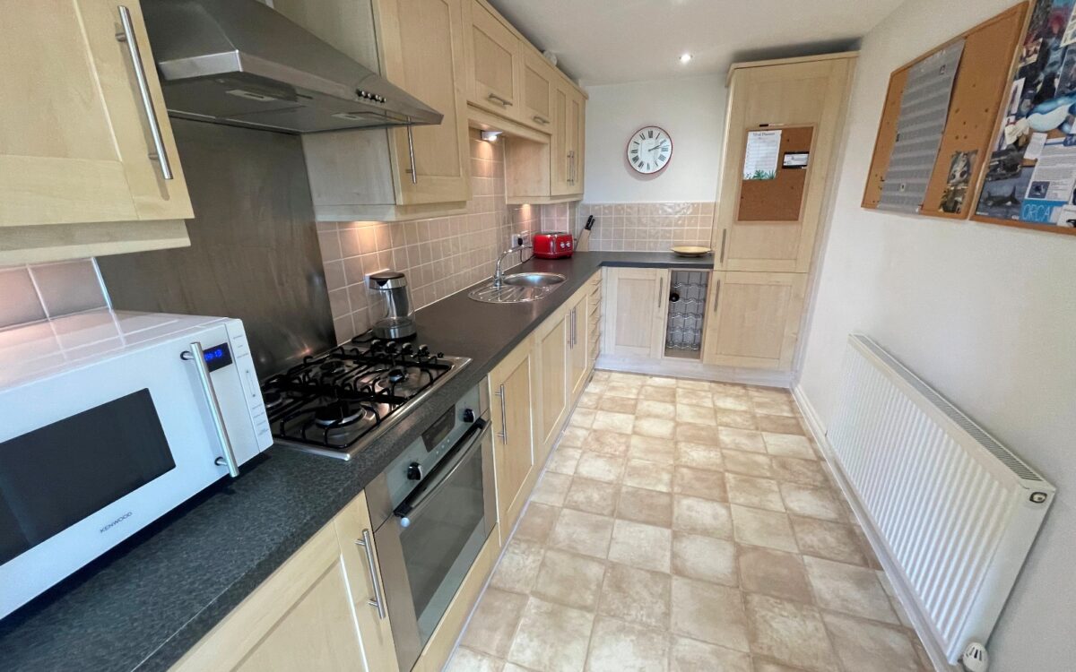 EXCELLENT FULLY FITTED KITCHEN: 13′ 0″ x (3.96m x 2.01m), part-tiled walls, fitted wall & floor units, illuminated working surfaces, ‘Electrolux’ gas hob, stainless steel splashback & stainless steel illuminated extractor hood over, ‘Electrolux’ oven, built-in wine rack, circular stainless steel sink with mixer tap & drainer, integrated: fridge/freezer, and ‘Hoover’ washer/dryer, 3 concealed downlighters, & radiator.