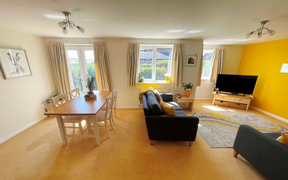 L-SHAPED LIVING ROOM: 14′ 7″ (4.44m) including uPVC double glazed bay window x 22′ 6″ (6.86m) (max. overall L-shaped measurement), 2 radiators, security entry-phone, 2nd uPVC double glazed window & uPVC double glazed double doors to the patio area.