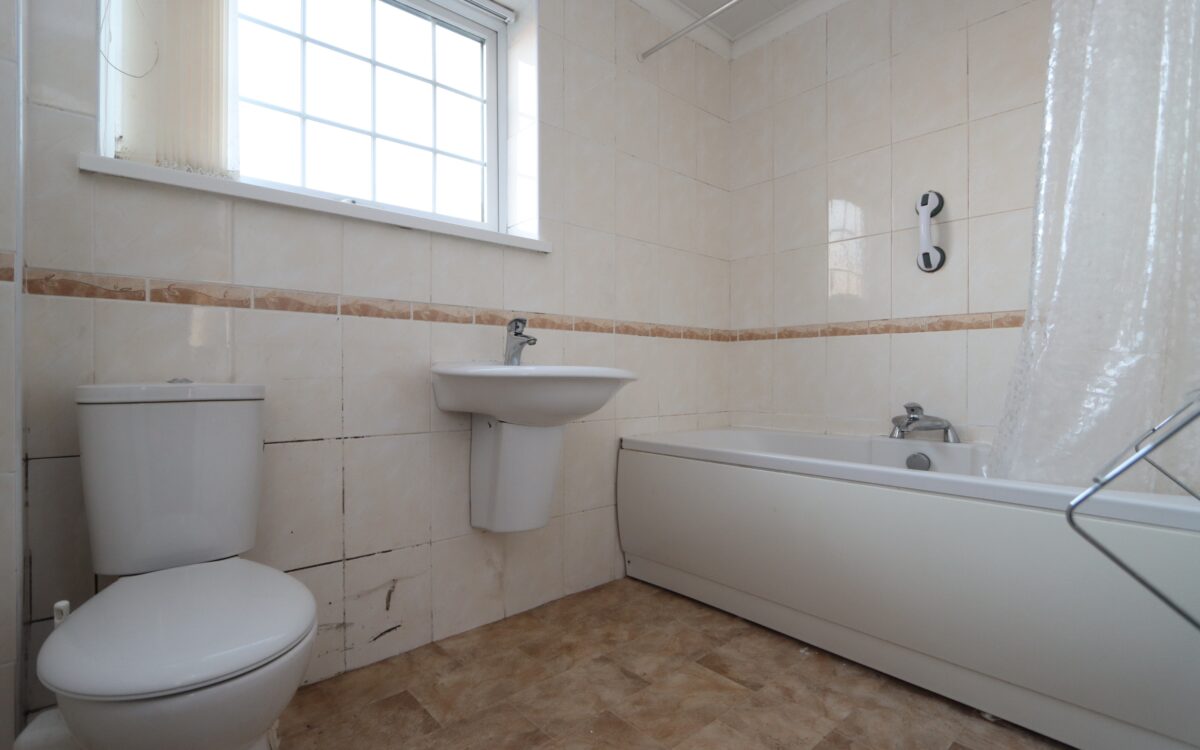 BATHROOM: tiled walls, low level WC, wall mounted washbasin, panelled bath with ‘Triton’ electric shower over, PVC ceiling incorporating extractor fan, radiator and uPVC double glazed window.