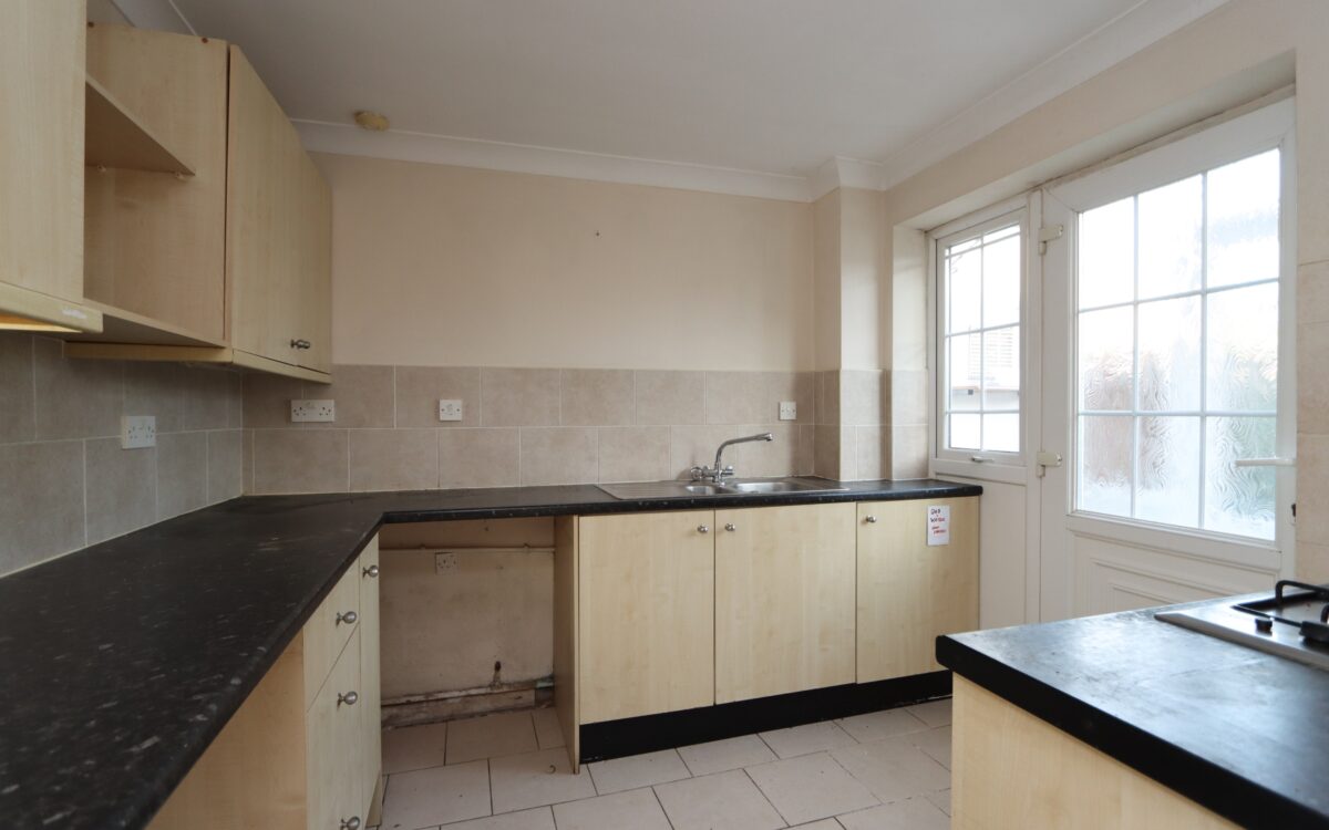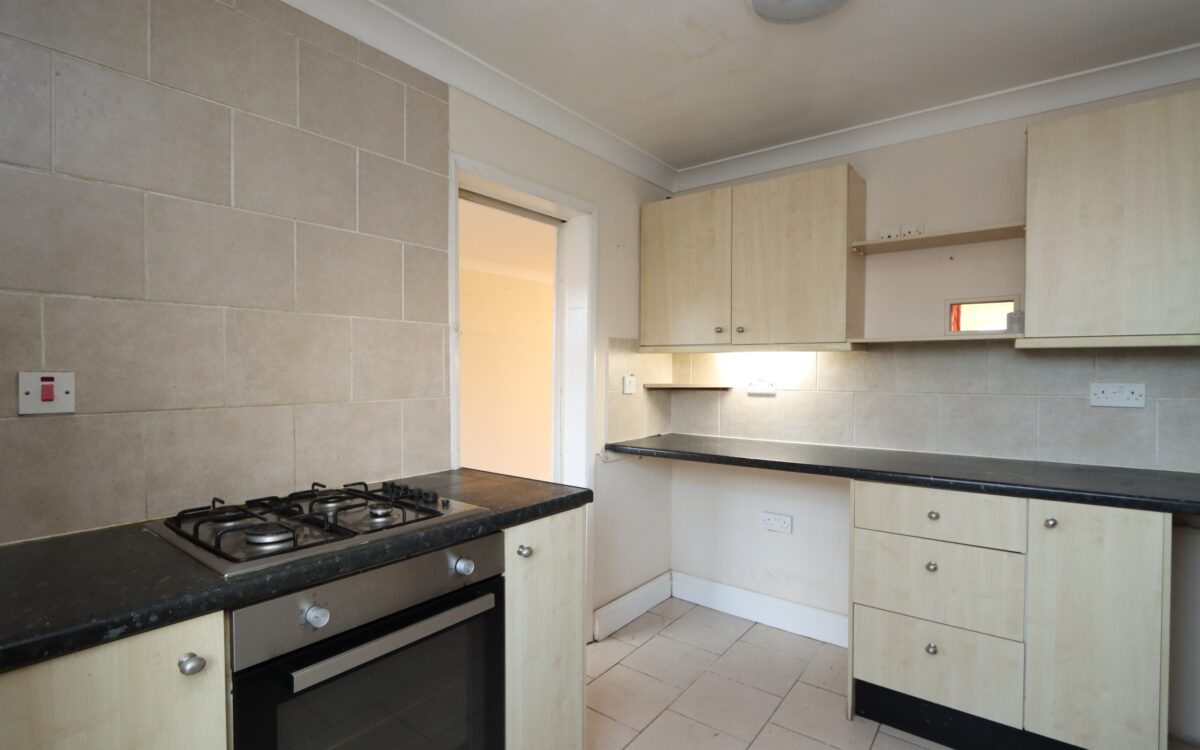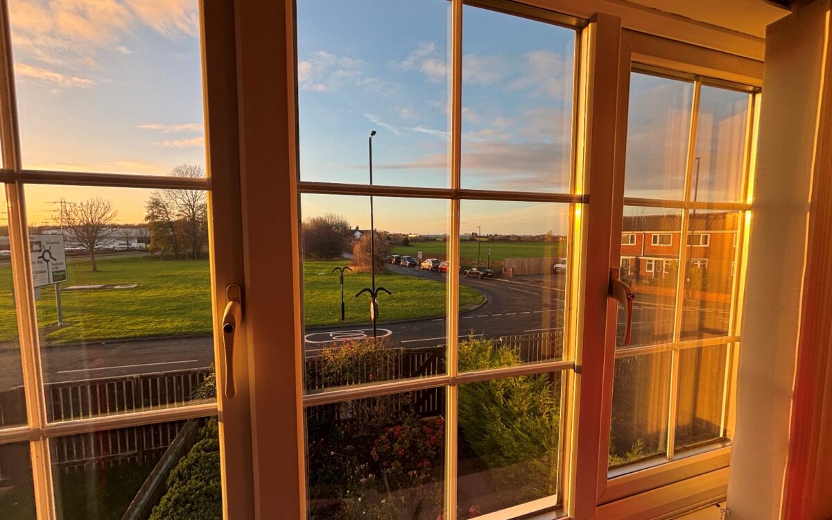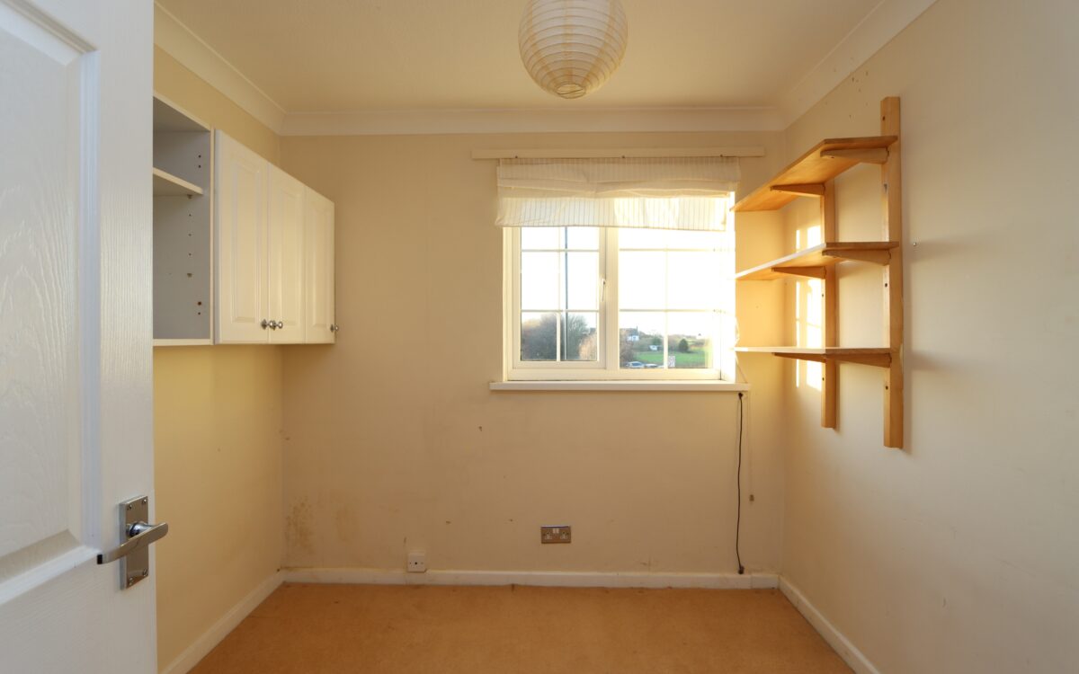 No. 3: at front, 8’ 7” x 8’ 6” (2.62m x 2.59m), fitted wall cupboards & shelving, radiator and uPVC double glazed window with roman blinds and an open aspect towards the fields of Murton.