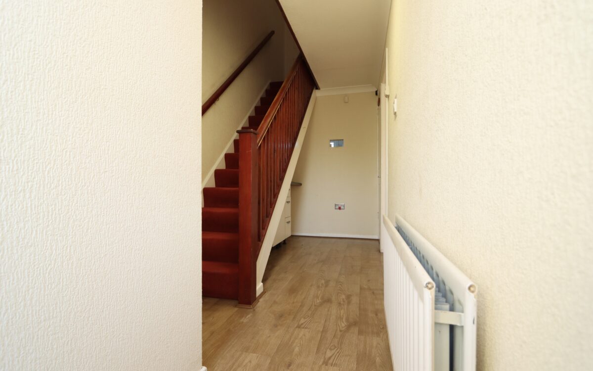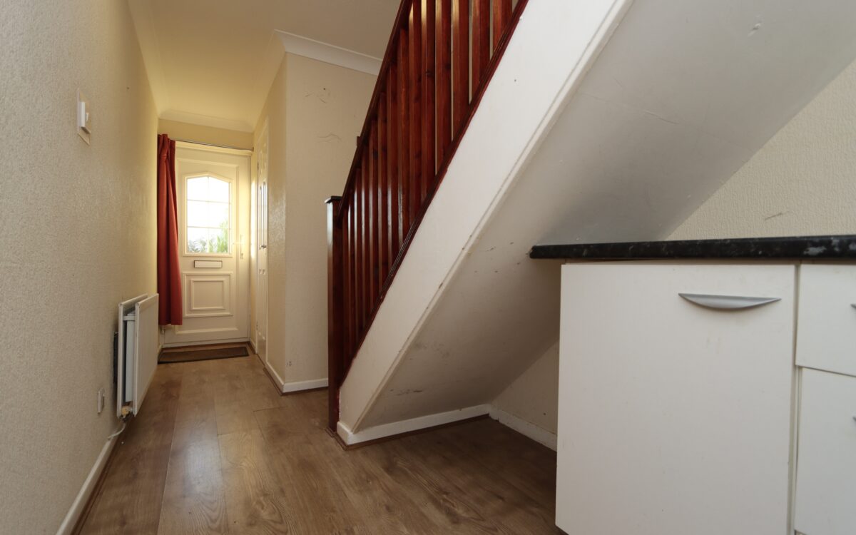 HALL: 17’ 3” x 5’ 11” (5.26m x 1.80m), laminate floor, double banked radiator, spindle staircase to first floor, understairs recess for storage, store cupboard and door to downstairs WC.