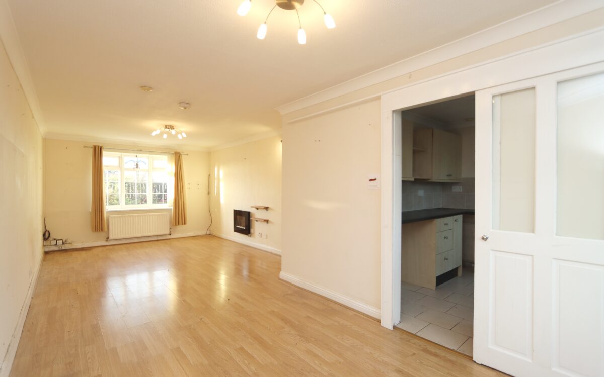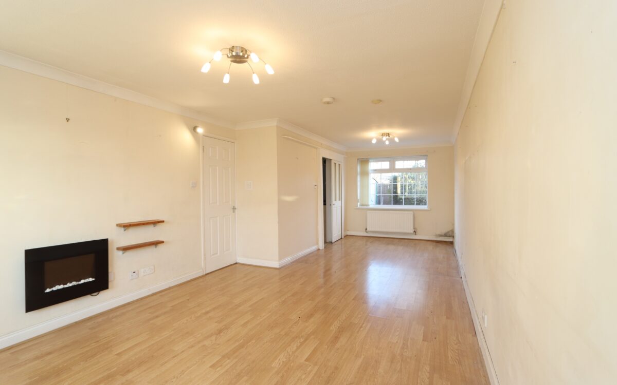 LIVING ROOM: 26’ 5” x 11’ 4” (8.05m x 3.45m – maximum overall L shaped measurement), laminate flooring, 2 double banked radiators, uPVC double glazed ‘Oriel’ bay window with open aspect & vertical louvred blinds, uPVC double glazed window with vertical louvred blinds & garden aspect and wall mounted fire (untested).