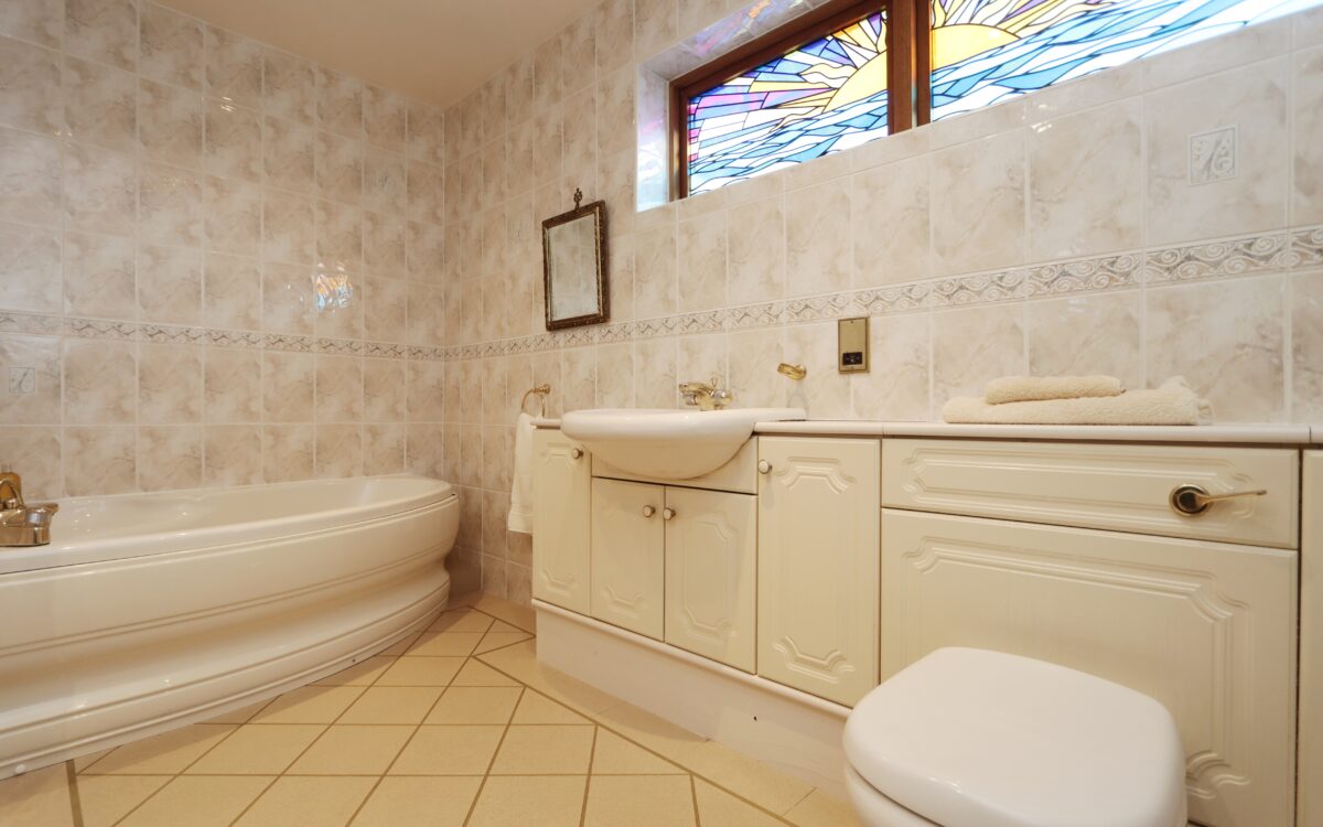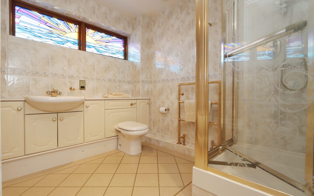 BATHROOM: 10’ 11” x 8’ 10” (3.33m x 2.69m – maximum overall L shaped measurement), fully tiled walls, leaded & stained glass feature window, vanity unit with washbasin & WC, corner bath, separate shower cubicle and heated towel rail.