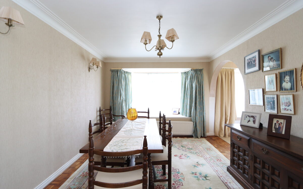 DINING ROOM: at rear, 13’ 8” x 10’ 5” (4.17m x 3.17m) plus double glazed Oriel bay window, double banked radiator, archway to lounge and glazed sliding doors to hallway.