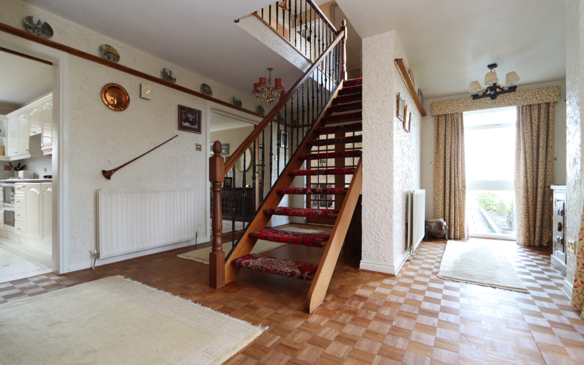 HALL: spacious and larger than average offering an ideal space to create an office or area to work from home, 21’ 10” x 12’ 11” (6.65m x 3.94m – maximum overall measurement), open tread staircase to first floor, parquet tiled floor, 2 double banked radiators, delft rack, feature fireplace incorporating electric fire and doors to reception rooms and downstairs WC.