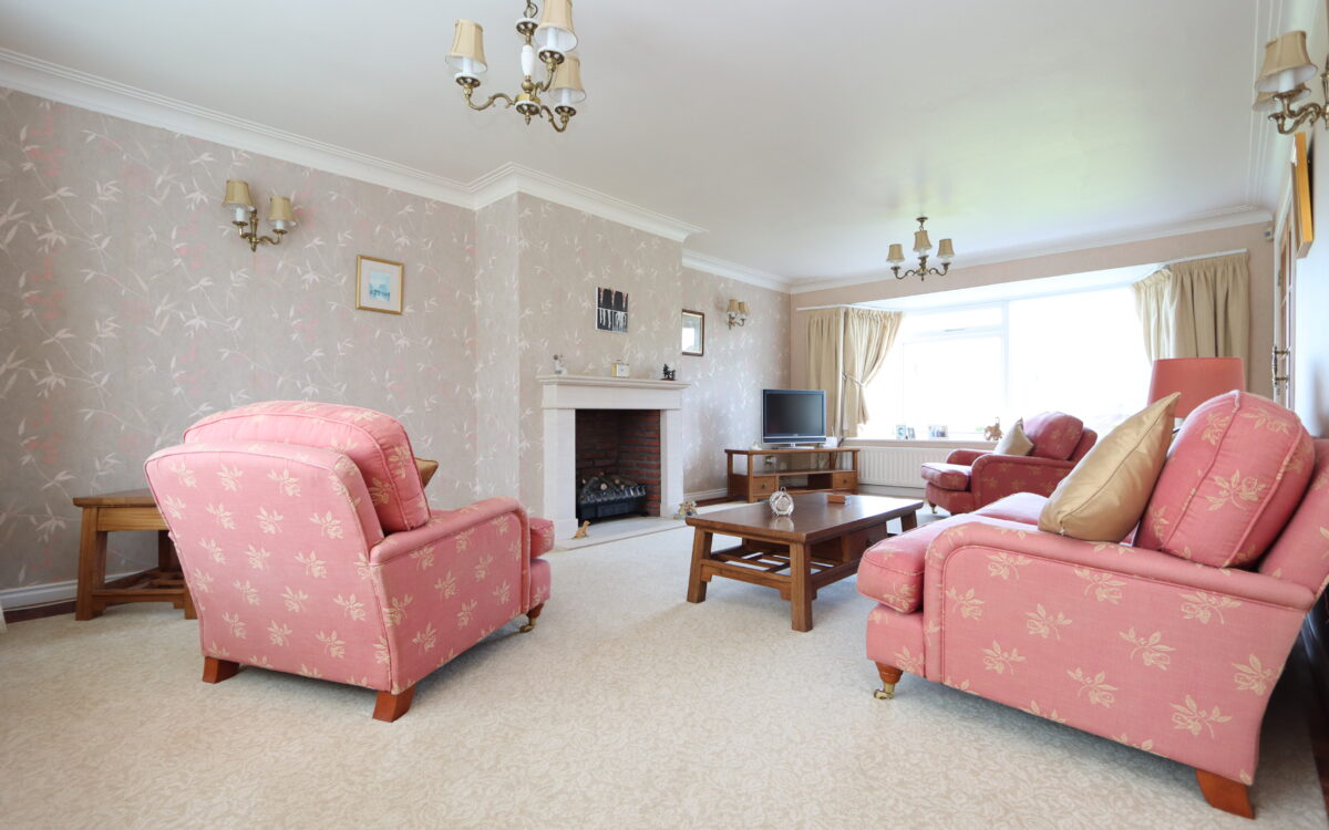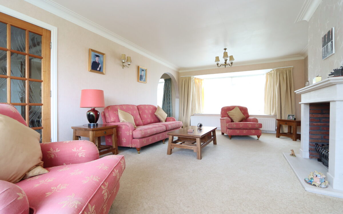 LOUNGE: 21’ 5” x 13’ 3” (6.53m x 4.04m) with double glazed Oriel bay windows to each end, stone fireplace & hearth with brick recess incorporating electric fire, glazed double opening doors to hallway, archway to dining room and double banked radiator.