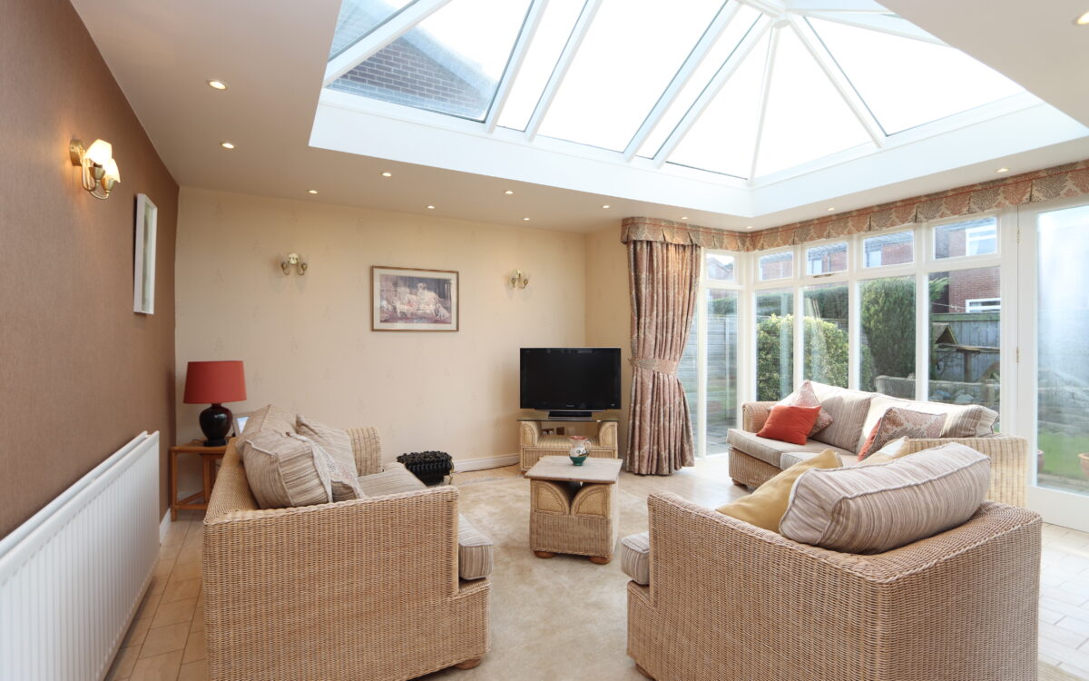 ORANGERY: at rear, 17’ 1” x 14’ 11” (5.21m x 4.55m), double glazed windows overlooking the rear garden, 19 concealed down lighters, double banked radiator, electric opening window to the roof lantern, and door to rear garden.