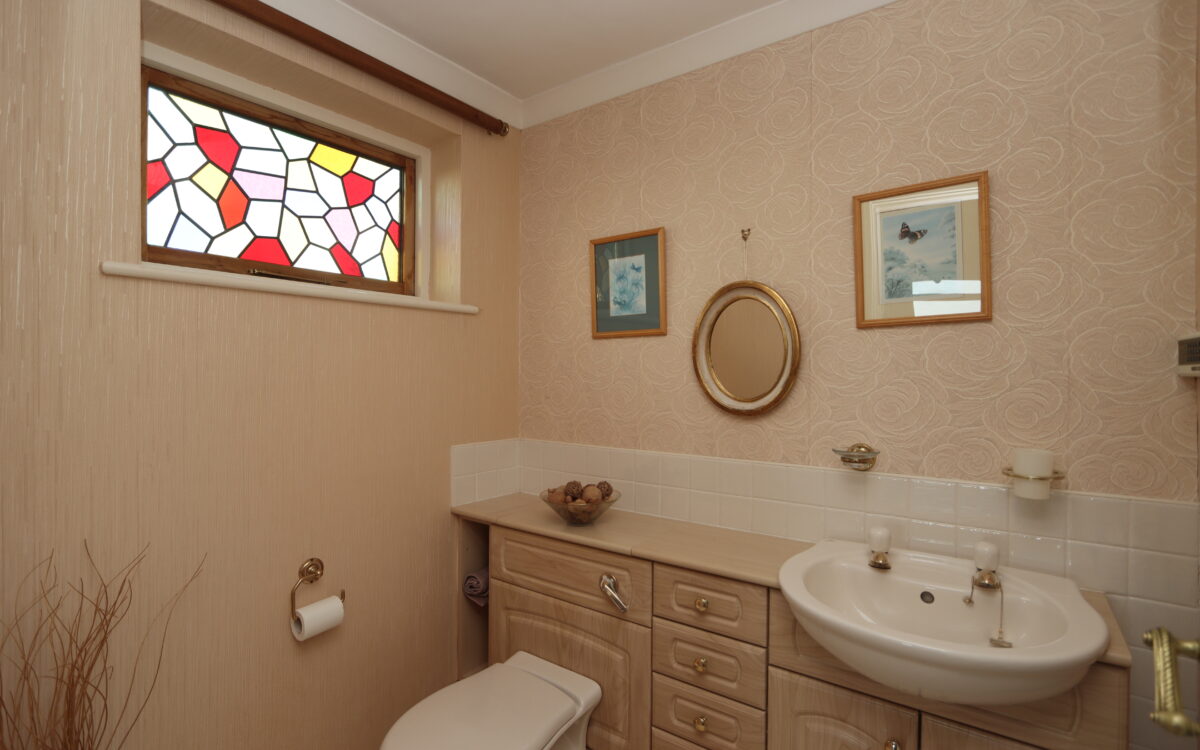 DOWNSTAIRS WC: radiator, feature leaded & stained glass window and vanity unit with tiled splashback incorporating washbasin & WC.