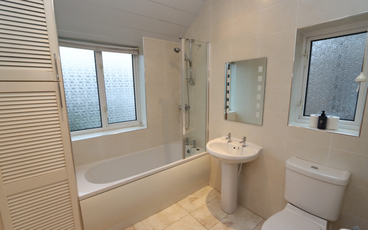 BATHROOM: with tiled walls and floor, panelled bath with shower over and screen, pedestal washbasin, low level WC, upright stainless steel towel radiator, cupboard containing ‘Worcester’ combi-boiler and 2 aluminium double glazed windows.