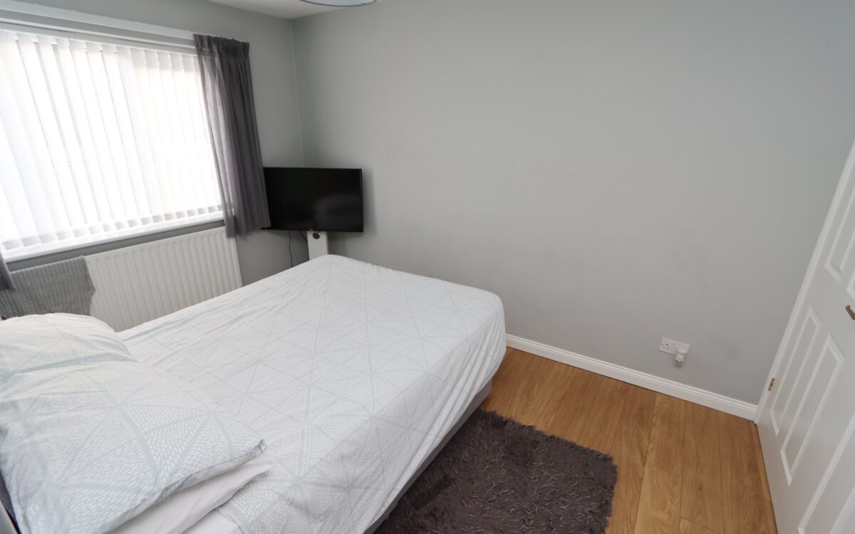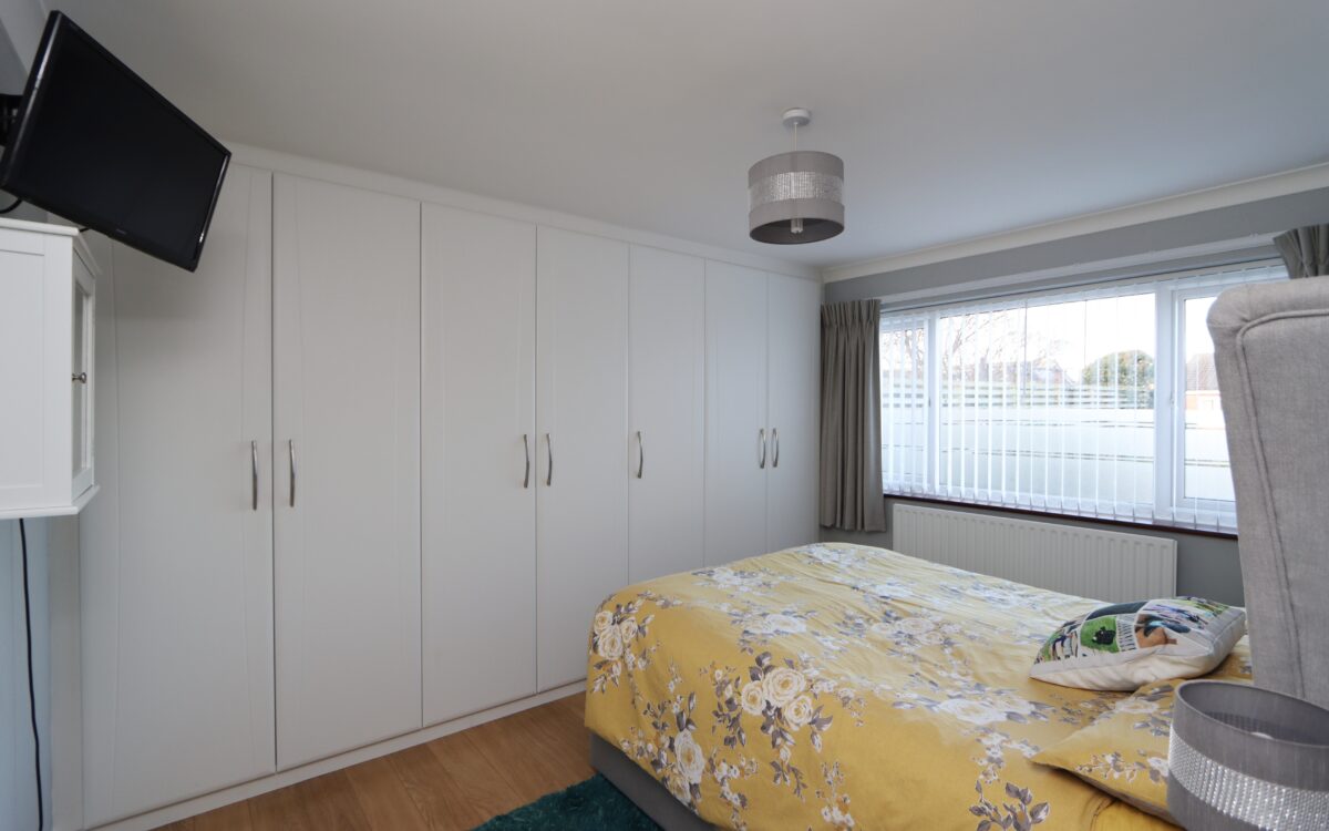 No. 1 8′ 9″ (2.67m) plus ‘Cavendish’ fitted wardrobes on 1 wall x 12′ 7″ (3.84m) plus 2nd double fitted wardrobe, wall-mounted ‘Sharp’ TV, radiator & uPVC double glazed window with vertical louvred blind.