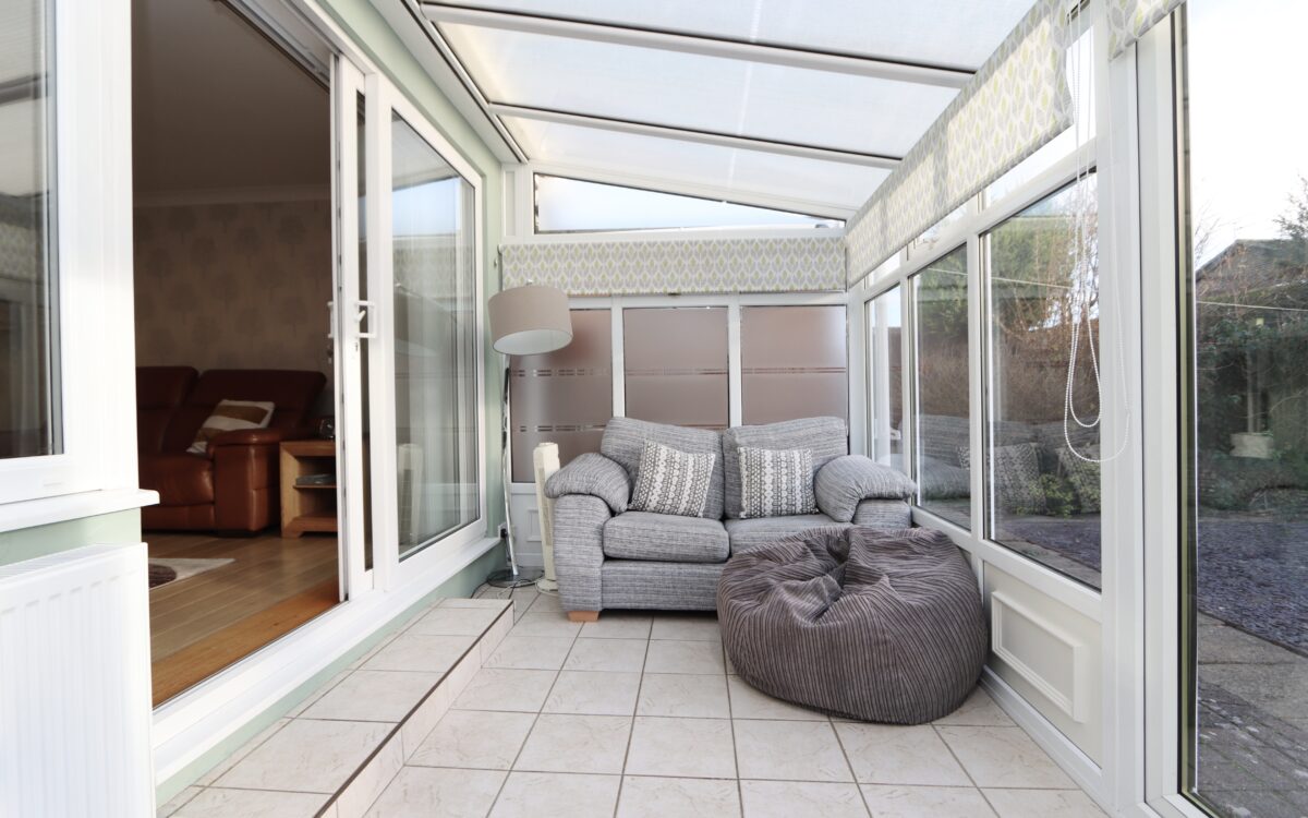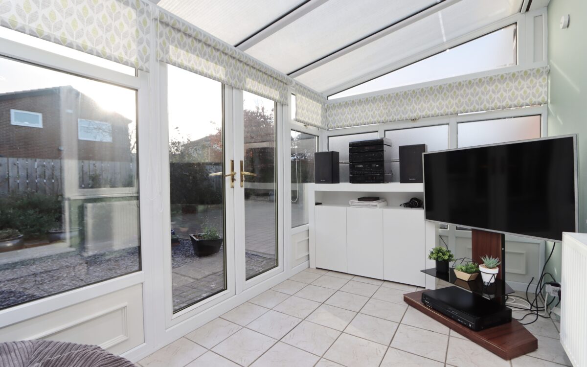 uPVC DOUBLE GLAZED CONSERVATORY 6′ 11″ x 13′ 10″ (2.11m x 4.22m) tiled floor, radiator, roller-blinds & uPVC double glazed double-opening doors to rear garden.