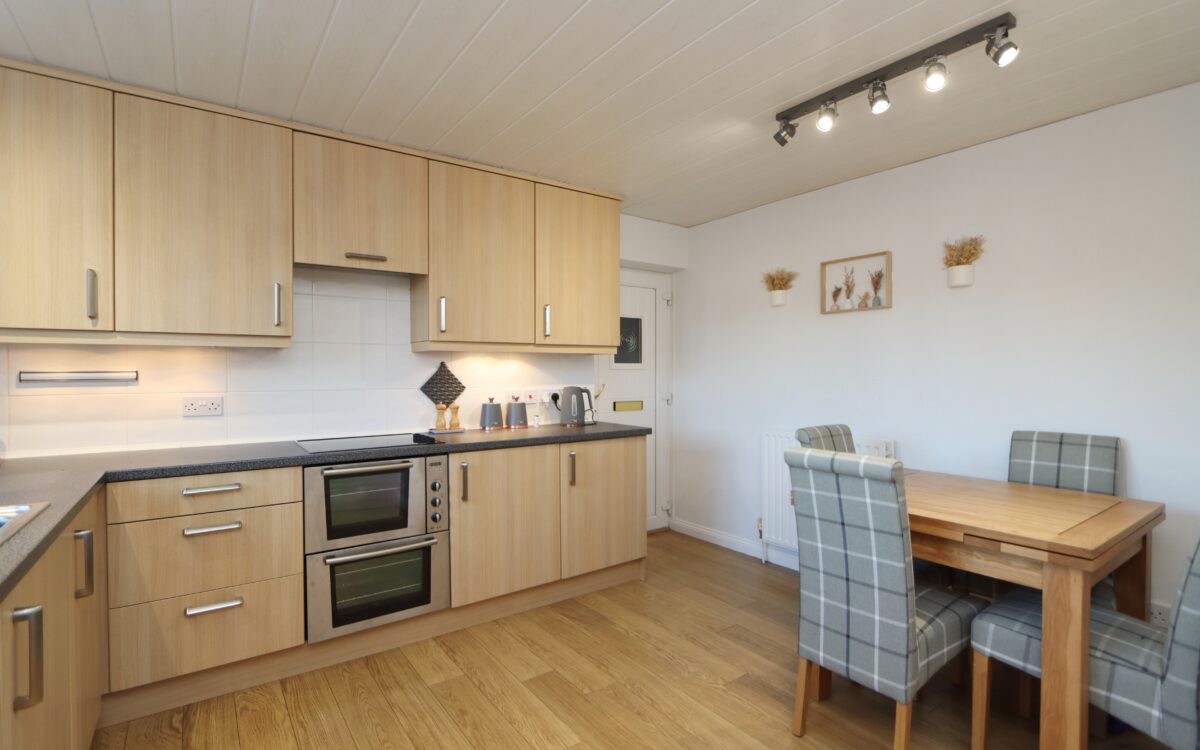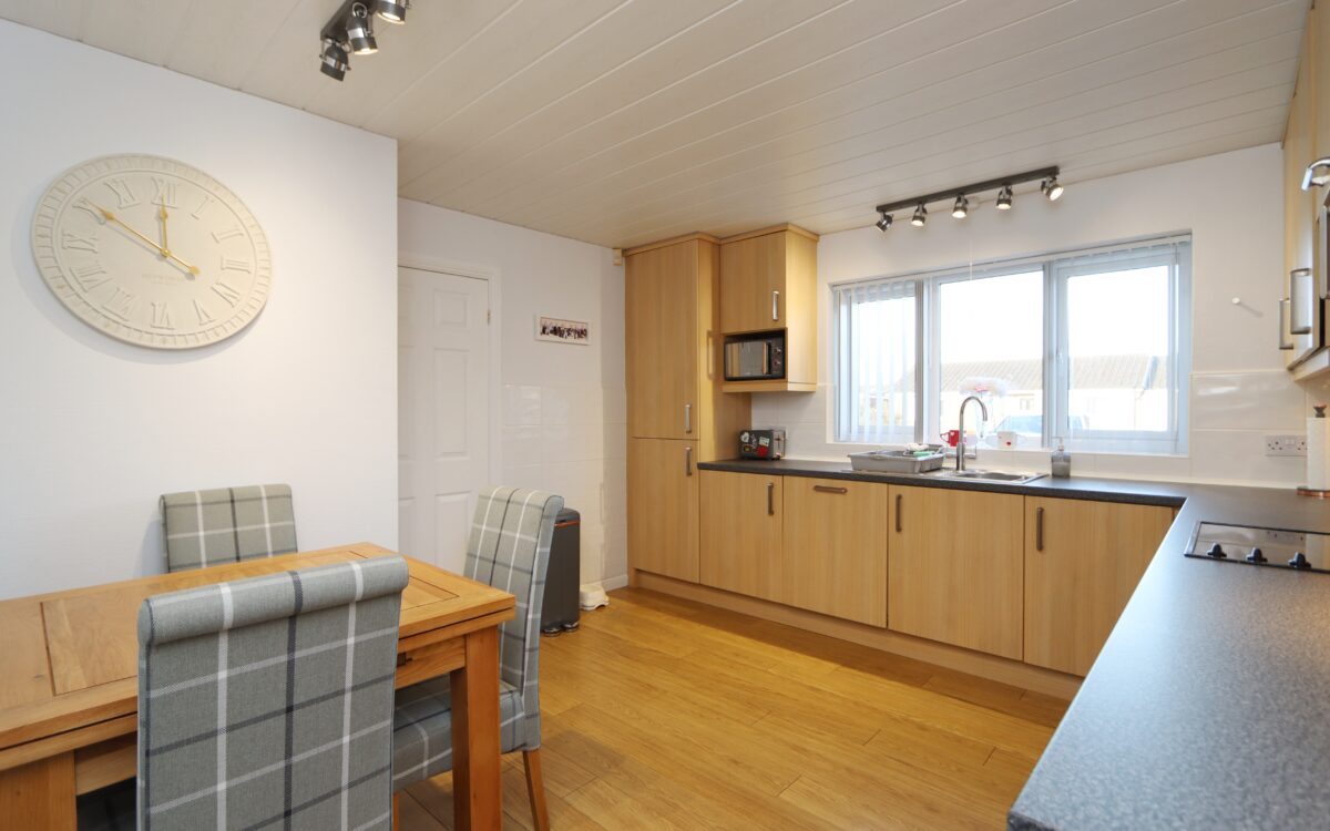 DINING KITCHEN 11′ 9″ x 12′ 8″ (3.58m x 3.86m) part-tiled walls, fitted wall & floor units, ‘Electrolux’ hob, extractor hood, ‘Electrolux’ oven, stainless steel sink, integrated dishwasher, integrated fridge & freezer, double-banked radiator & uPVC double glazed window with vertical louvred blind.