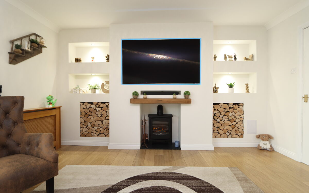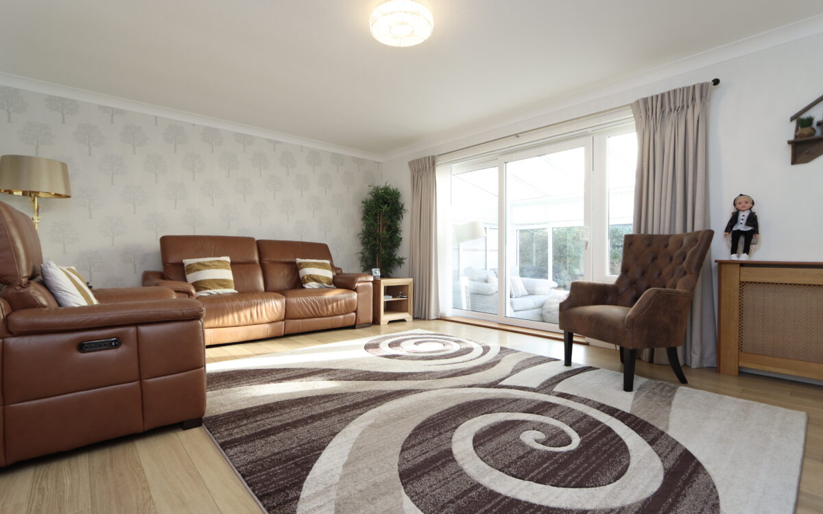 LIVING ROOM 18′ 9″ x 13′ 9″ (5.71m x 4.19m) including media wall with concealed downlighters, electric log-effect burner, 3 radiators with covers & uPVC double glazed patio door to conservatory.