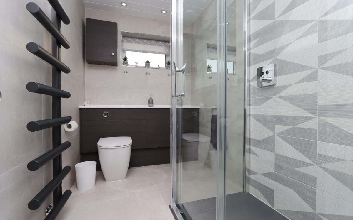 REFITTED SHOWER ROOM (inst. 2024) tiled floor & walls, large walk-in shower enclosure, vanity unit, low level WC, contemporary radiator & uPVC double glazed window.