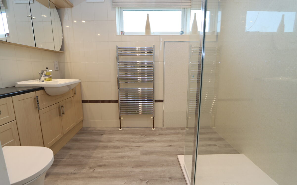 SHOWER ROOM: 8’ 8” x 8’ 5” (2.64m x 2.57m), large walk-in shower enclosure, vanity unit with washbasin & low level WC, part tiled walls, shaver point, illuminated medicine cabinet, upright stainless steel towel radiator, uPVC double glazed window and 5 concealed down lighters.