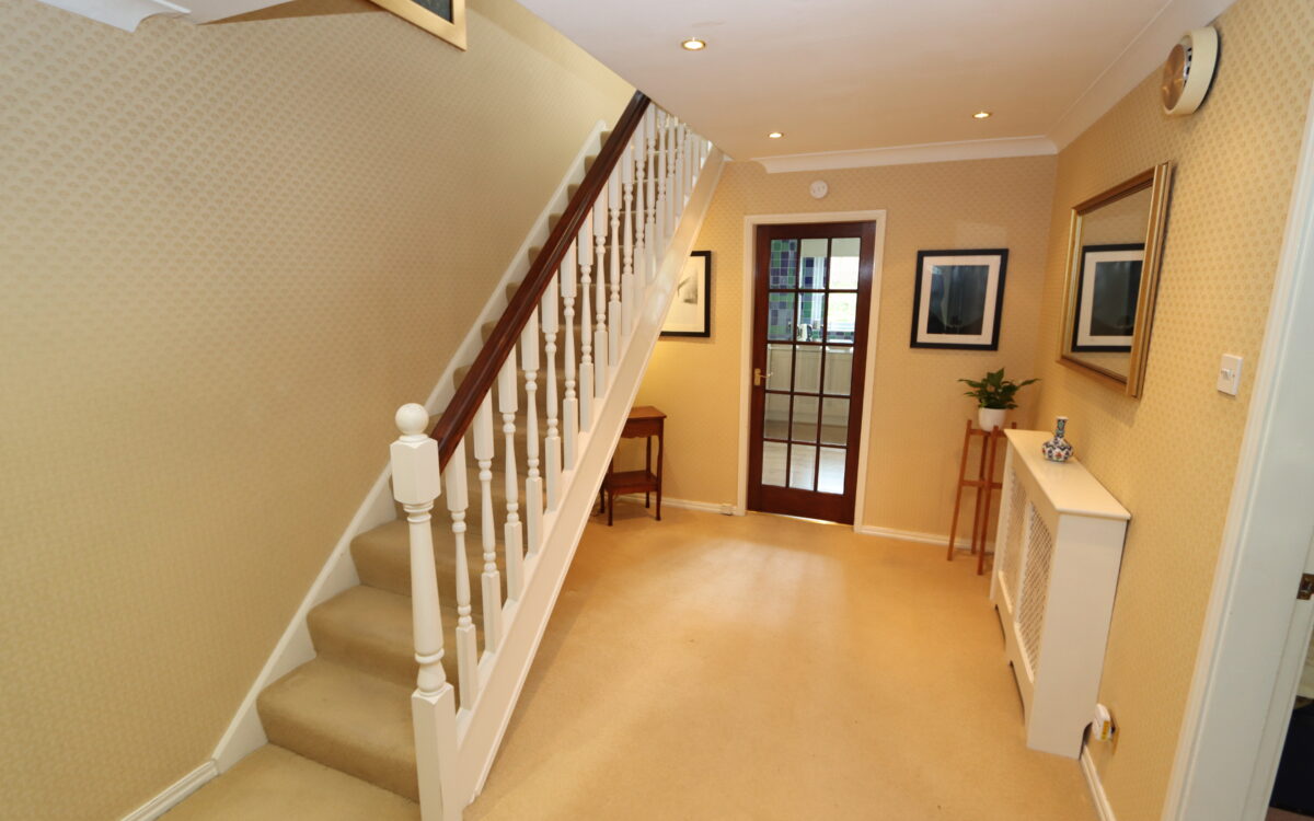 HALL: 13’ 5” x 8’ 11” (4.09m x 2.72m), radiator with cover, 7 concealed down lighters and spindle staircase leading to the first floor.
