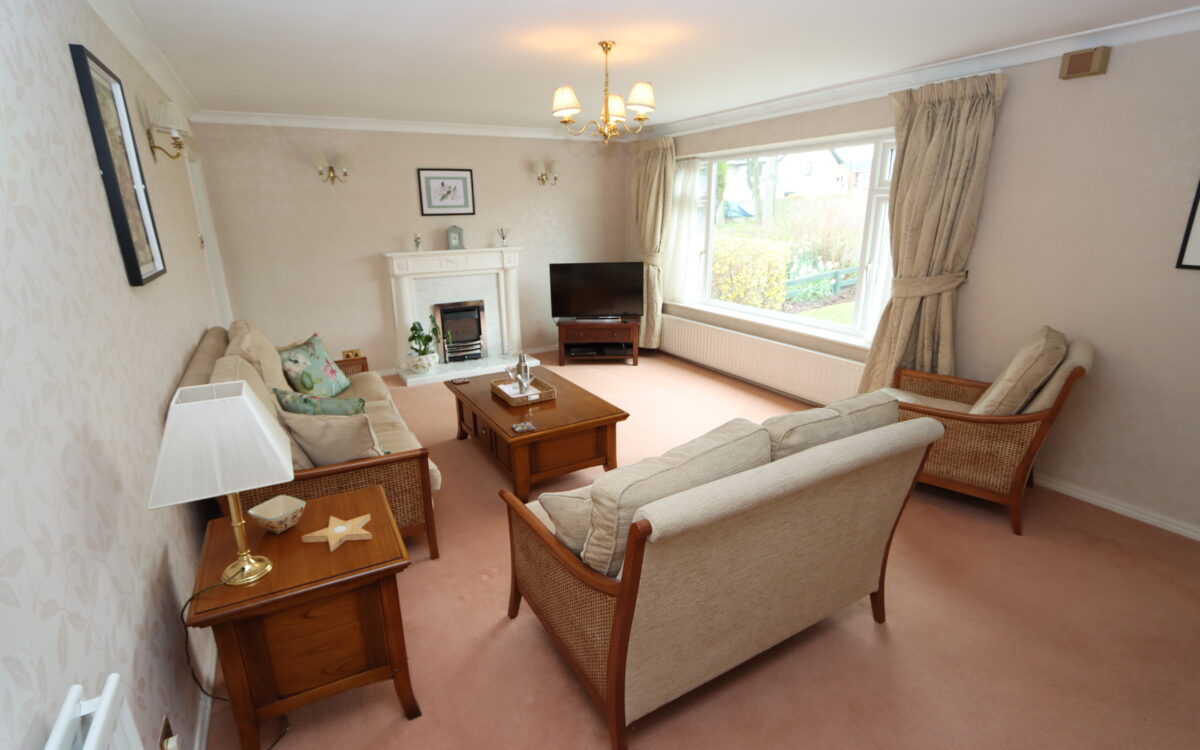 LOUNGE: at front, 20’ 2” x 13’ 5” (6.15m x 4.09m), 2 double banked radiators, attractive fireplace with fitted gas fire, uPVC double glazed window, 4 fitted wall lights and glazed door to dining room.