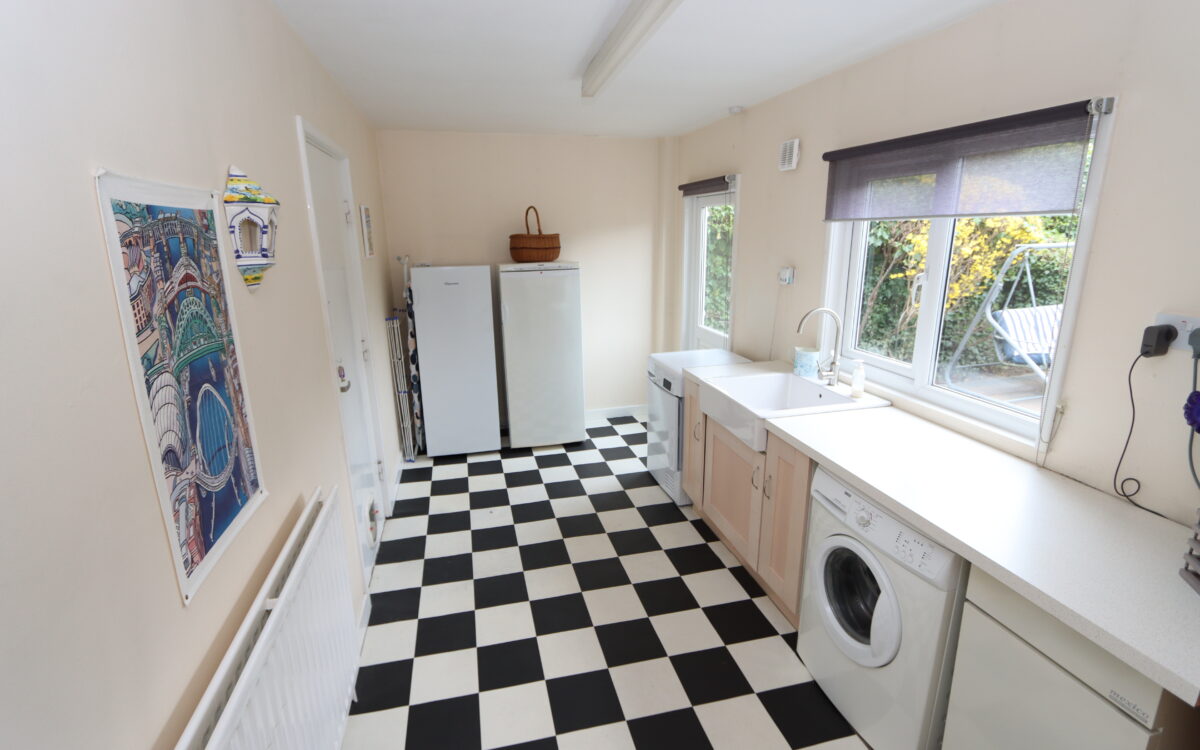 UTILITY ROOM: 15’ 6” x 7’ 7” (4.72m x 2.31m), Belfast style sink with mixer tap, double banked radiator, plumbing for washing machine, uPVC double glazed window with roller blind, under bench ‘Mexico’ gas fired central heating boiler, door to garage and uPVC double glazed door with roller blind leading to rear garden.