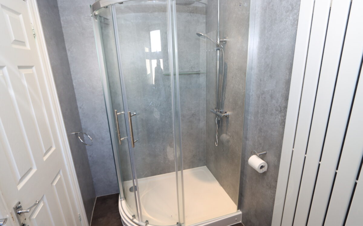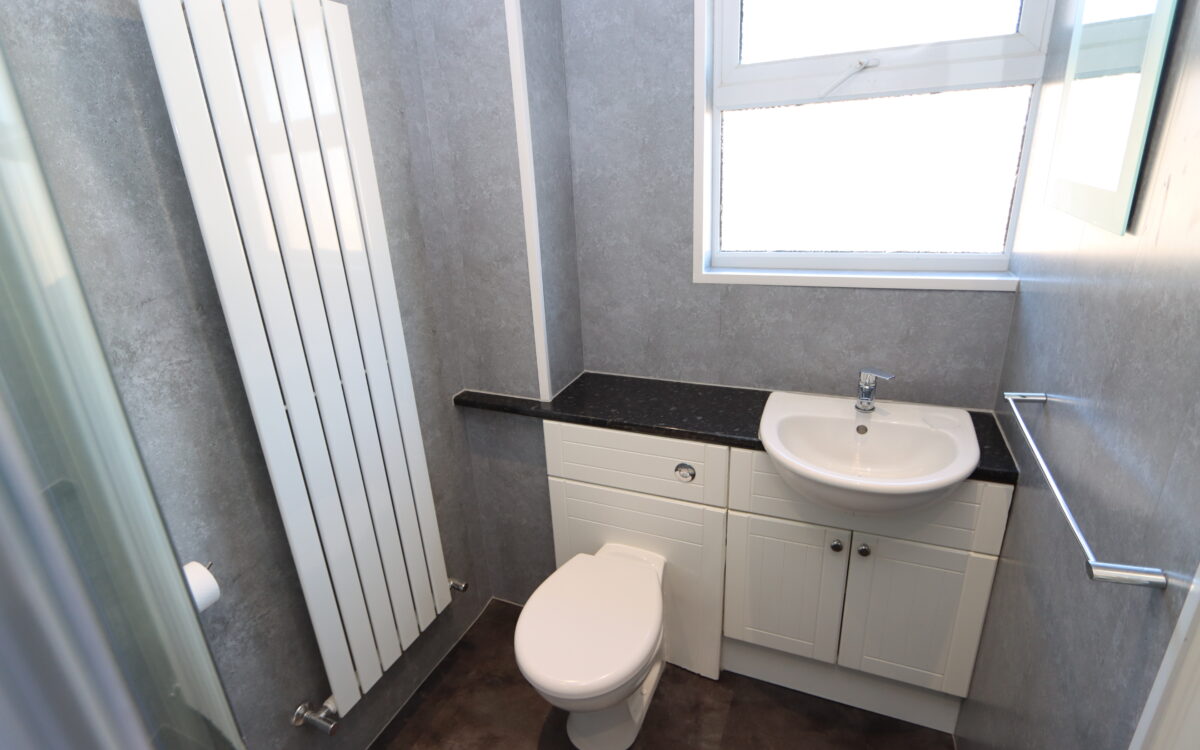 REFITTED SHOWER ROOM: vanity unit, low level WC, shower cubicle, upright radiator, PVC ceiling with 4 concealed downlighters & uPVC double glazed window.