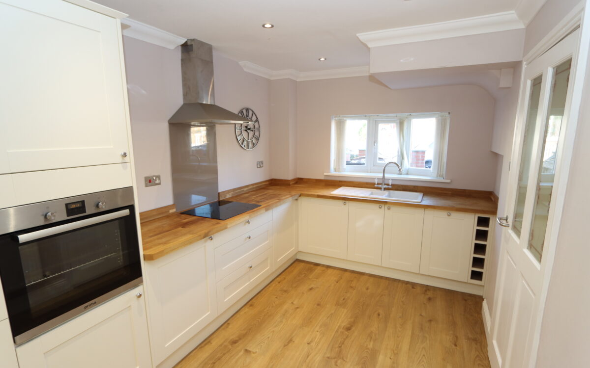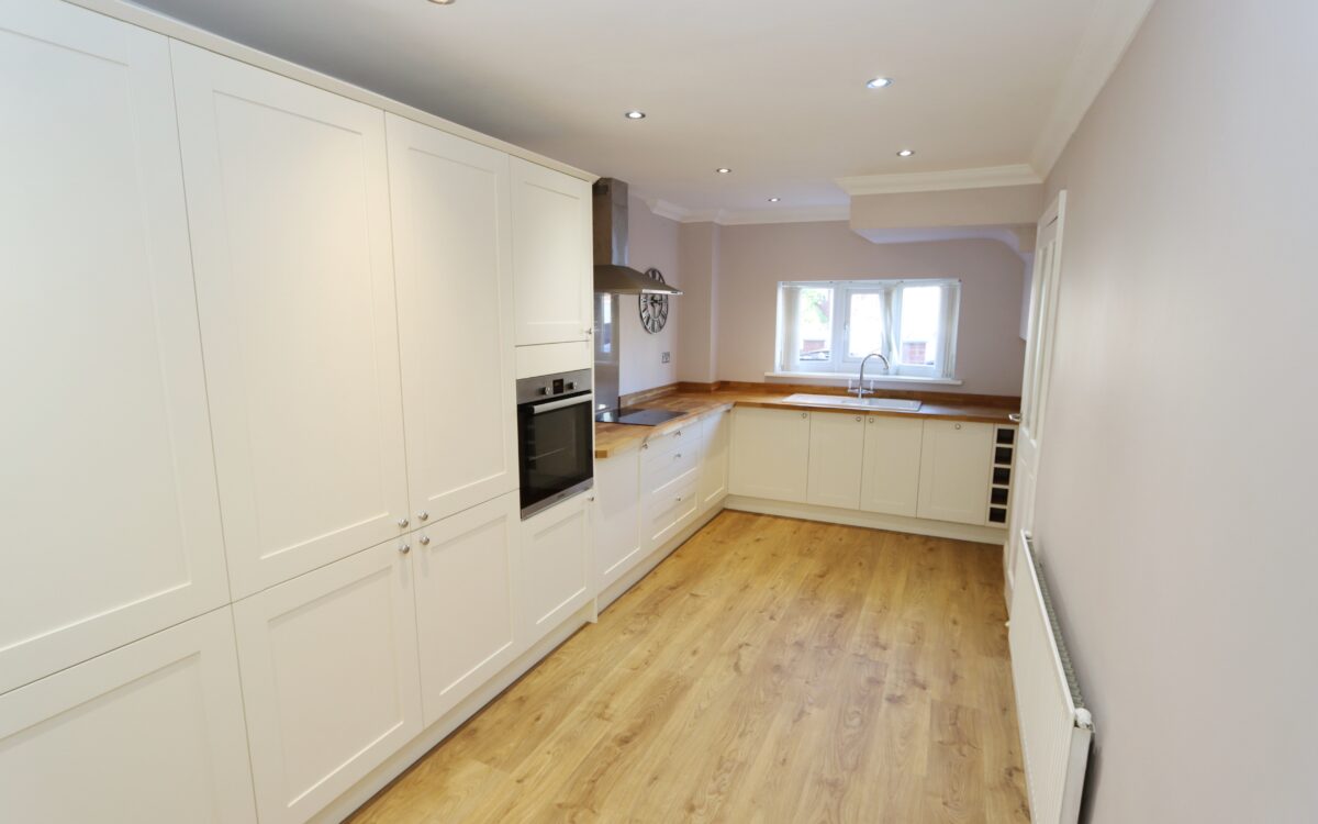 REFITTED KITCHEN: 19’4″ x 8’5″ (5.89m x 2.57m) fitted wall & floor units, 1½ bowl sink, electric hob, ‘Prima’ oven, stainless steel extractor hood, integrated fridge/freezer, radiator & uPVC double glazed bay window.