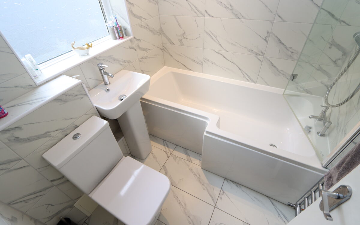 REFITTED BATHROOM: with tiled walls and floor, shower shaped bath with shower over and screen, low level WC, pedestal washbasin, upright stainless steel towel radiator, medicine cabinet, ‘Vent-Axia’ extractor fan and uPVC double glazed window.