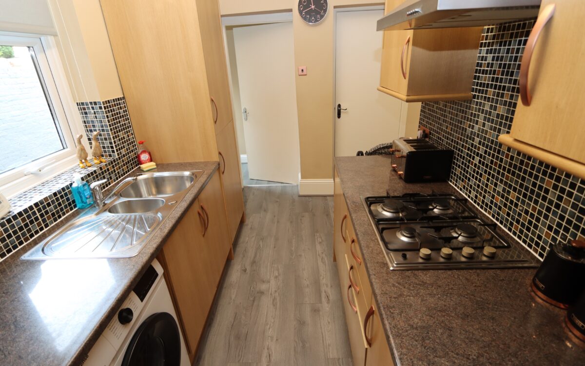 FITTED KITCHEN: 13’8″ x 6’9″ (4.17m x 2.06m) with fitted wall and floor unites, stainless steel sink with drainer, gas hob with extractor hood above, eye-level oven, plumbing for washing machine, integrated fridge freezer, ‘i Mini’ combi boiler (installed 2022), double banked radiator, uPVC double glazed window plus large fitted store cupboard.