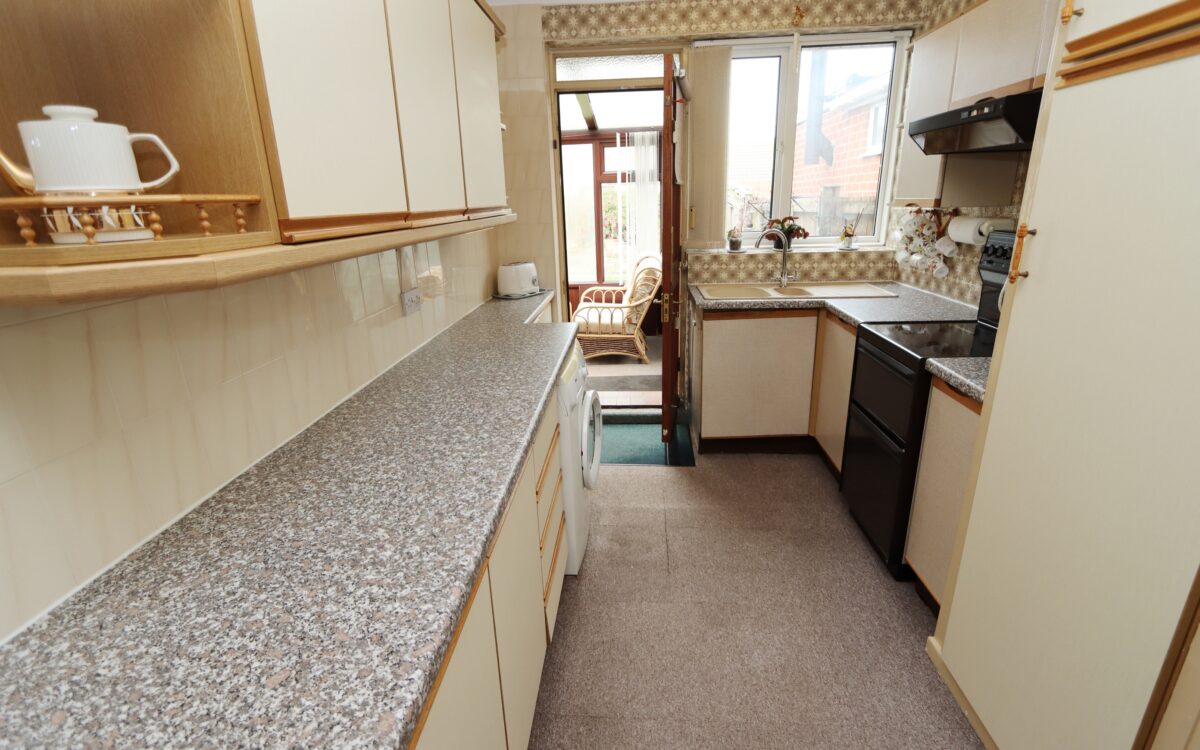 BREAKFASTING KITCHEN: 14’5″ x 7’11” (4.39m x 2.41m) with fitted wall & floor units, partially tiled walls, radiator, cupboard containing ‘Worcester’ combi boiler, plumbing for washing machine, 1½ bowl sink, uPVC double glazed window and door to conservatory.