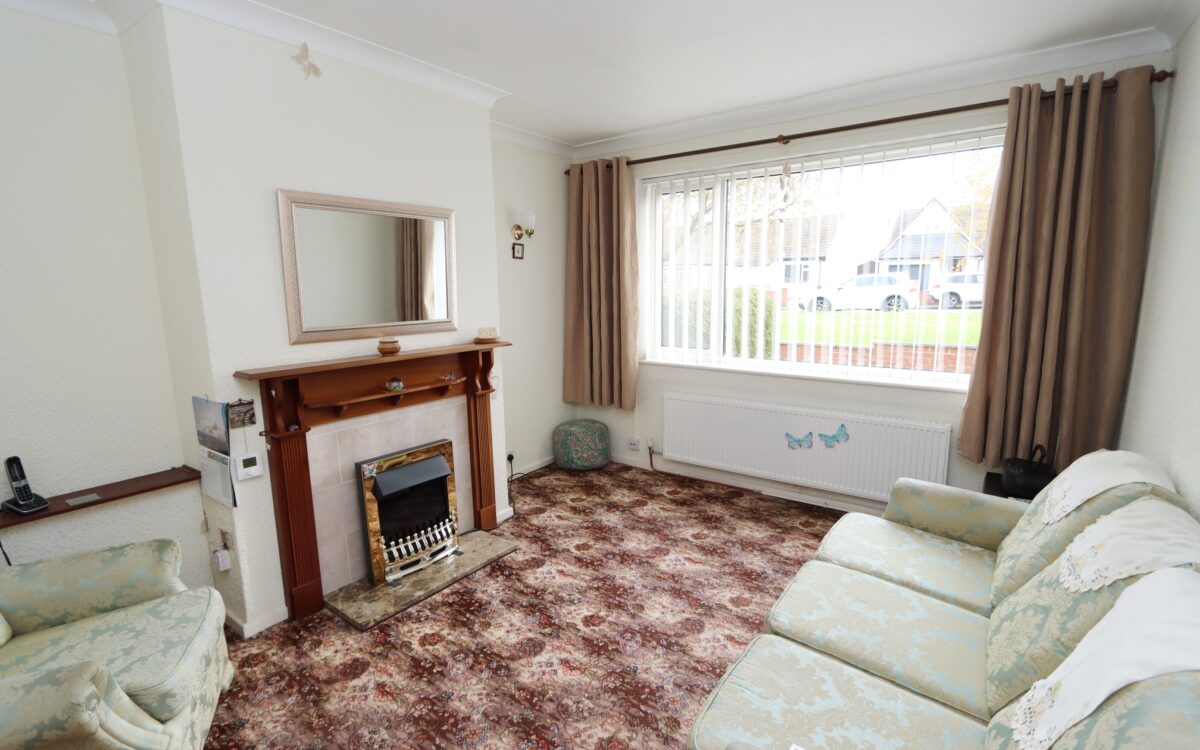 LOUNGE: 11’1″ x 13’6″ (3.38m x 4.11m) with radiator, fireplace with electric fire, uPVC double glazed window with vertical louvre blinds.