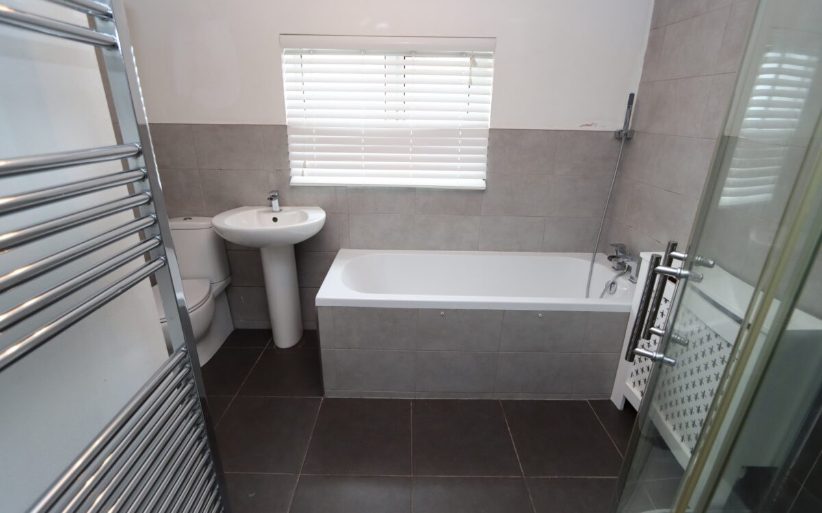 BATHROOM: tiled floor, tiled walls, panelled bath, pedestal washbasin, low level WC, separate shower cubicle, upright stainless steel towel radiator, cupboard containing ‘Beko’ washing machine, radiator, uPVC double glazed window, fitted linen cupboard and extractor fan.