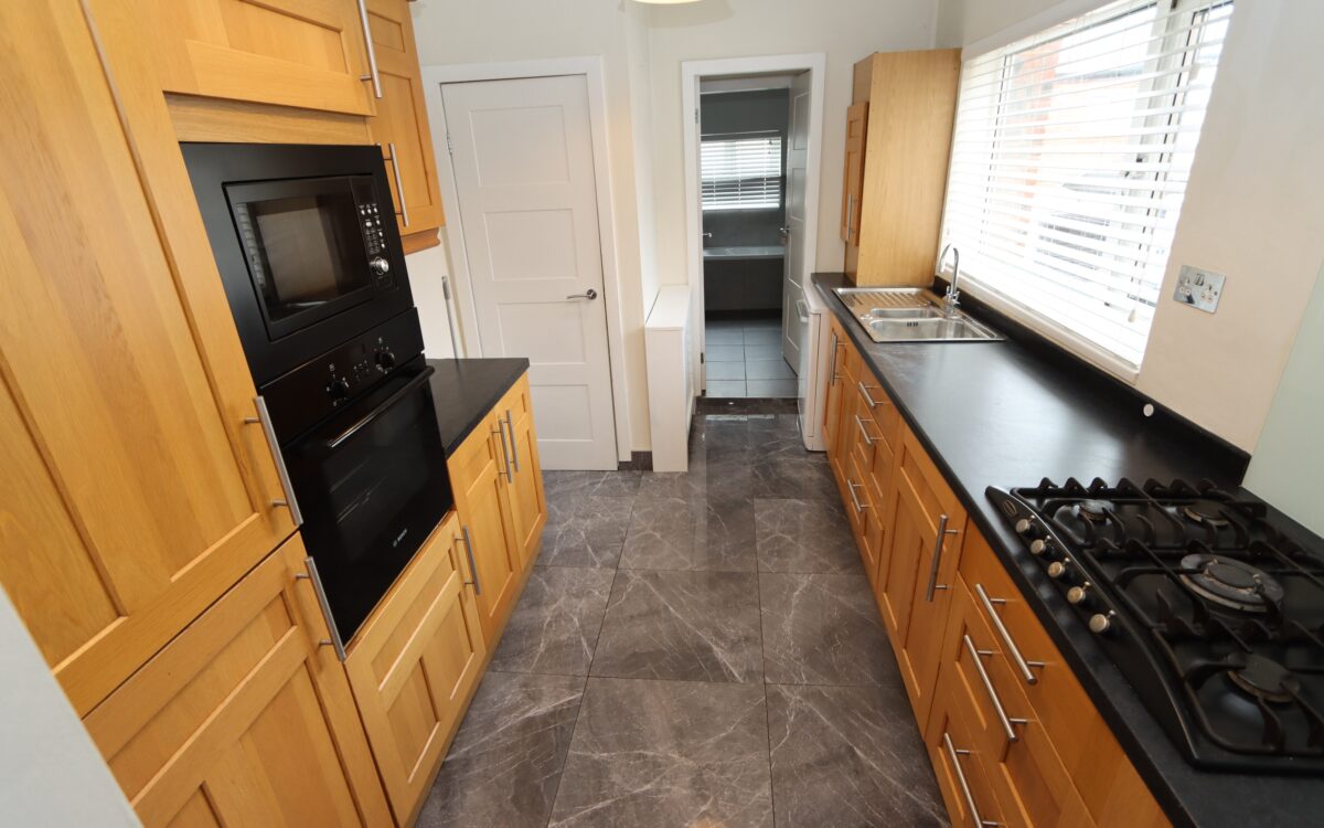 KITCHEN: 12’ 5” x 8’ 3”, good range of fitted wall & floor units, tiled floor, 5 ring gas hob with splashback, ‘Bosch’ eye level oven, built in microwave, integrated fridge/freezer, ‘Sharp’ dishwasher, 1½ bowl stainless steel sink with drainer and matching mixer tap, radiator, cupboard containing gas fired central heating combi boiler, door to rear staircase, and uPVC double glazed window with venetian blinds.