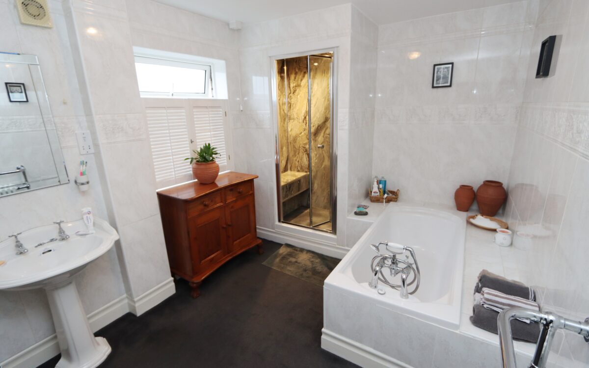 EXTENDED BATHROOM: 10’10” x 8’3″ (3.30m x 2.51m) fully tiled walls, pedestal washbasin, bath with shower attachment on taps, steam/shower cubicle, towel radiator and uPVC double glazed window with plantation shutters.