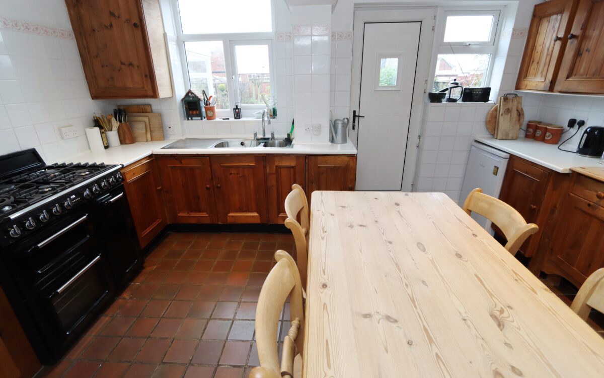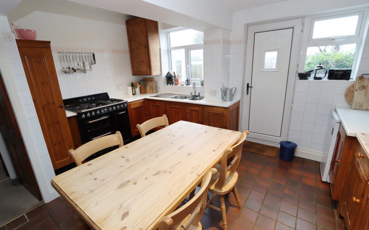 DINING KITCHEN: 14’1″ x 11’11” (4.29m x 3.63m) with tiled floor and partially tiled walls, fitted wall and floor units, ‘Smeg’ range style cooker, 1½ bowl sink with waste disposal unit, upright towel radiator, cupboard containing ‘Baxi’ combi boiler, 2 uPVC double glazed windows and uPVC double glazed door to rear garden.
