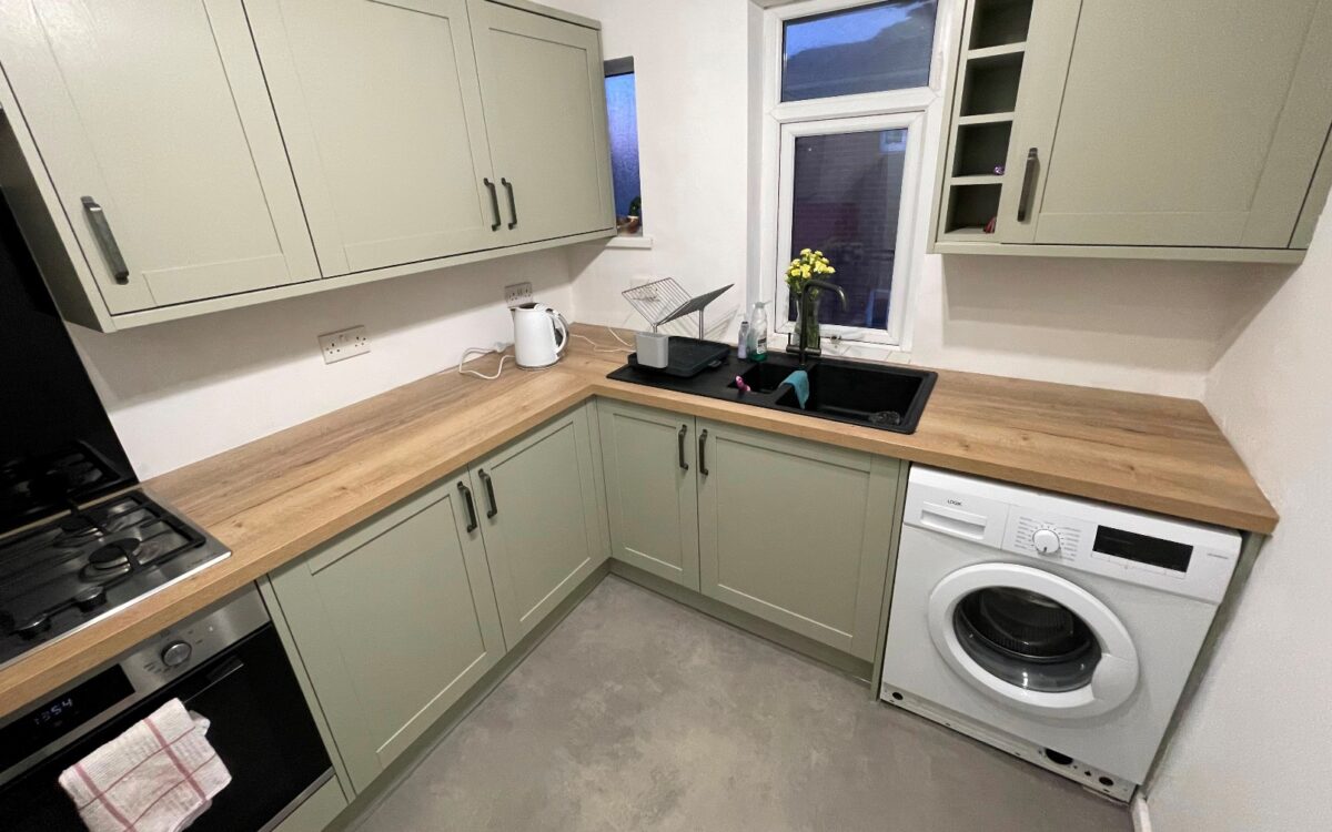 KITCHEN: 7’5″ x 8’11” (2.27m x 2.47m) with double banked radiator, fitted wall & floor units, ‘Lamana’ gas hob, electric oven, ‘Logik’ washing machine, 1½ bowl sink & 2 uPVC double glazed windows.