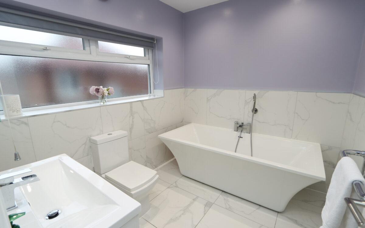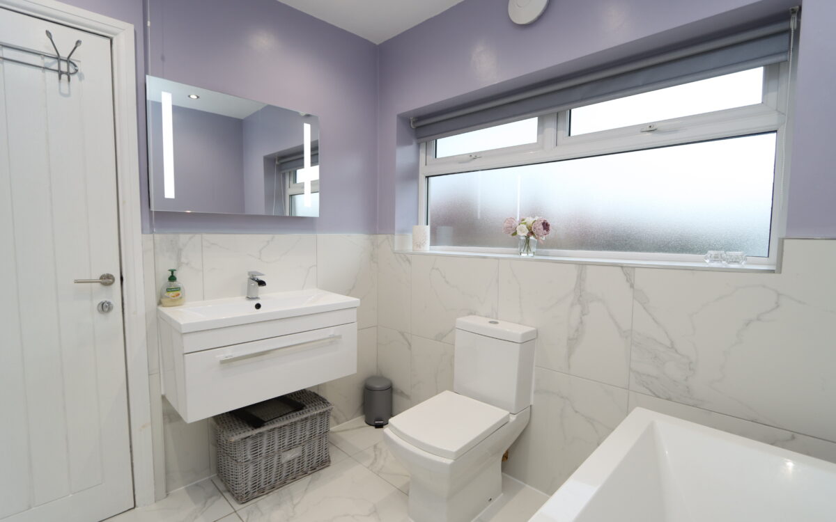 BATHROOM: refitted, 8’ 2” x 7’ 1” (2.49m x 2.16m), part tiled walls, tiled floor, wall mounted vanity unit with washbasin, low level WC, bath with shower attachment on taps, heated towel radiator, 6 concealed down lighters, illuminated mirror, uPVC double glazed window with roller blind and extractor fan.