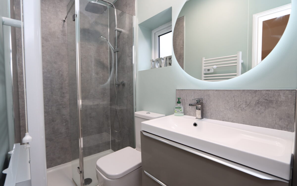 EN-SUITE SHOWER ROOM: vanity unit with washbasin, low level WC, upright towel radiator, extractor fan, uPVC double glazed window, illuminated mirror and shower enclosure with rain head shower, secondary diverter and panelled walls.