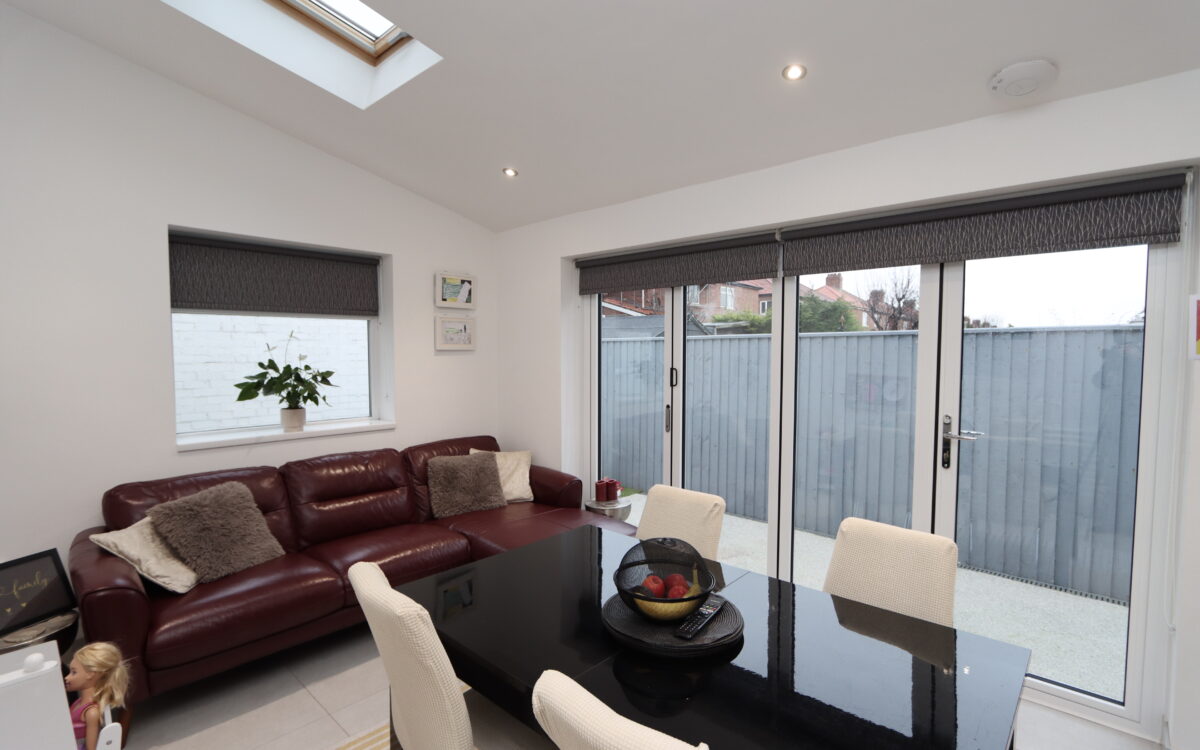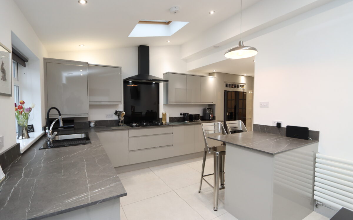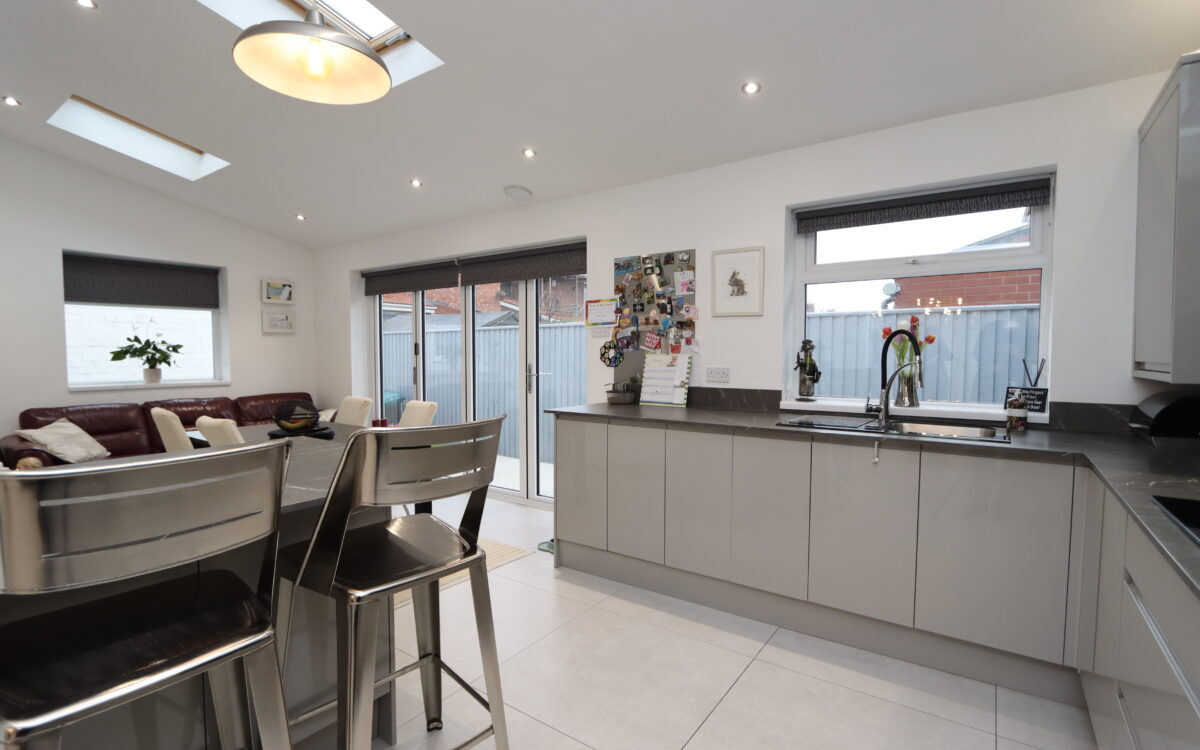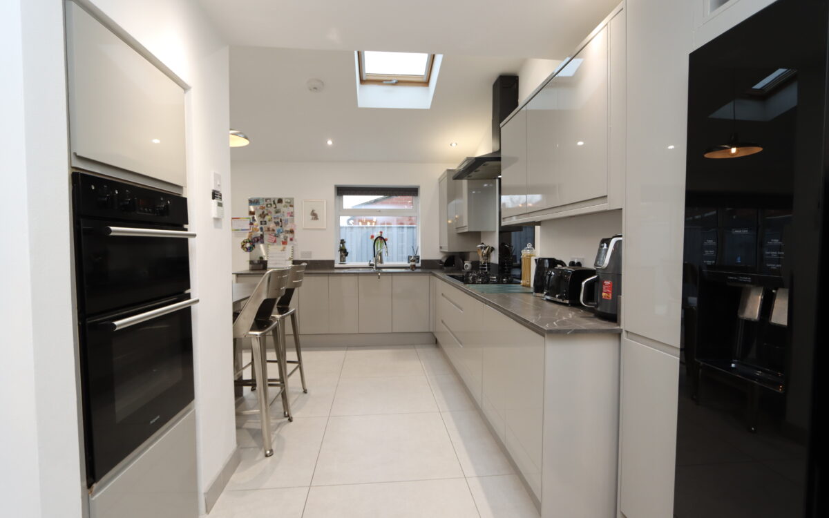 DINING KITCHEN: at rear, refitted & extended, 22’ 6” x 18’ 7” (6.86m x 5.66m – maximum overall L shaped measurement), part vaulted ceiling with 3 double glazed ‘Velux’ windows, double glazed bi-folding doors leading to the rear garden with roller blinds, an excellent range of fitted wall & floor units in light grey hi-gloss, fitted breakfast bar, ‘Samsung’ American style fridge freezer, ‘Hotpoint’ eye level double oven, 5 ring gas hob with illuminated extractor hood above and splashback, cupboard containing ‘Potterton’ titanium gas fired combination boiler, inset sink with drainer & mixer tap with spray function, ‘Hotpoint’ washer/dryer, 15 concealed down lighters, tiled floor, 2 uPVC double glazed windows with roller blinds and radiator.