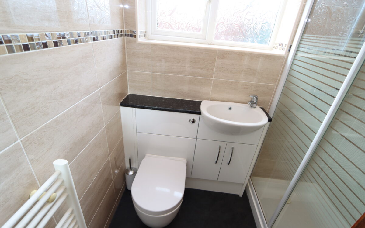 SHOWER ROOM: with tiled walls, shower cubicle, vanity unit, low level WC, upright towel radiator, medicine cabinet, shaver point and uPVC double glazed window.