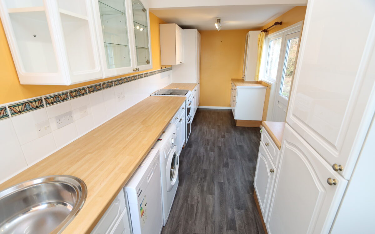 KITCHEN: 18’3″ x 6’11” (5.56m x 2.11m) with fitted wall and floor units, radiator, ‘Logik’ dishwasher, ‘Hotpoint’ washing machine, ‘Cannon’ gas cooker, 2 uPVC double glazed windows and uPVC double glazed door to rear garden.