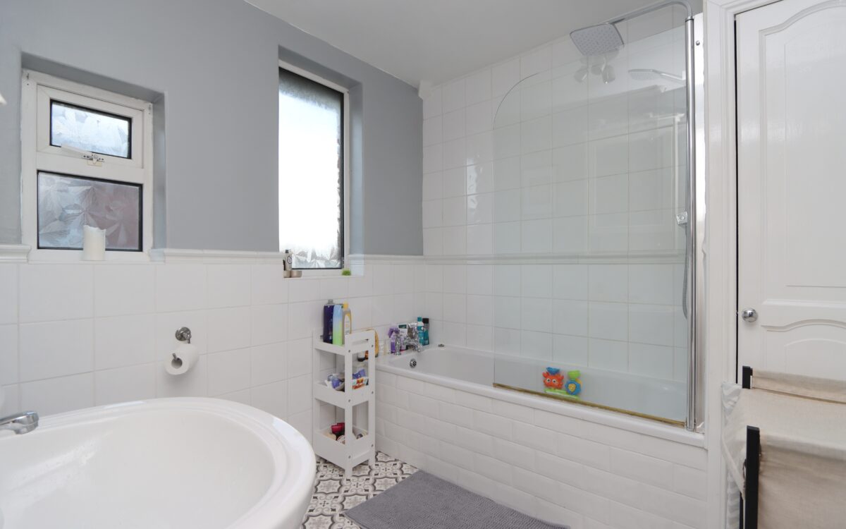 BATHROOM: ½ tiled walls, pedestal washbasin, low level WC, 2 uPVC double glazed windows, bath with tiled side & splashback, mixer shower over & screen, radiator and cupboard housing ‘Baxi’ gas fired combination boiler installed 2021.