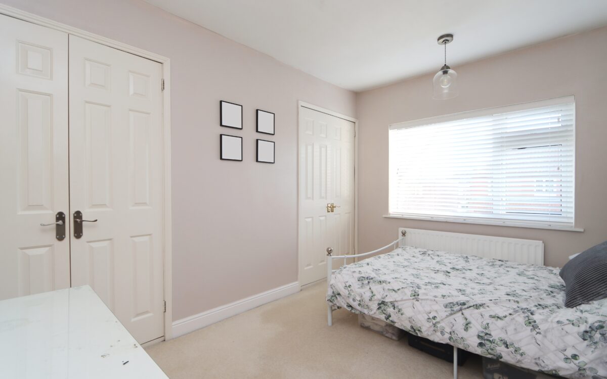 No. 2: at front, 12’ 0” x 9’ 1” (3.66m x 2.77m) plus 2 double fitted wardrobes, radiator and uPVC double glazed window with venetian blinds.