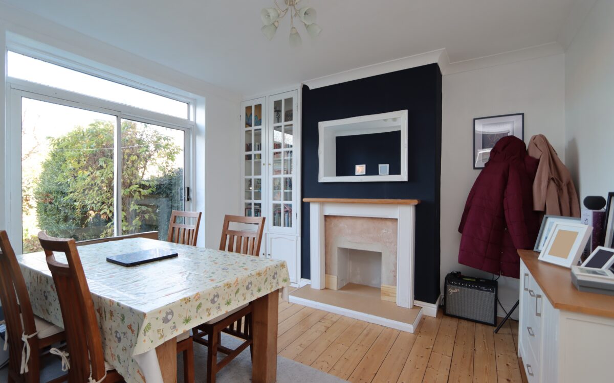 DINING ROOM: 12’ 0” x 11’ 6” (3.66m x 3.51m), traditional style fireplace with recess for fire, radiator with cover, stripped & varnished original floorboards, fitted storage to one alcove, and double glazed sliding patio door overlooking and leading to the rear garden.