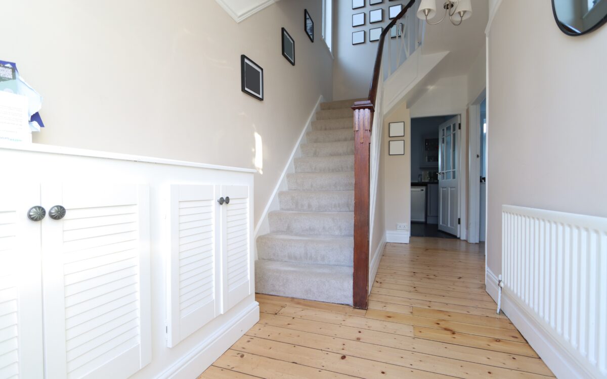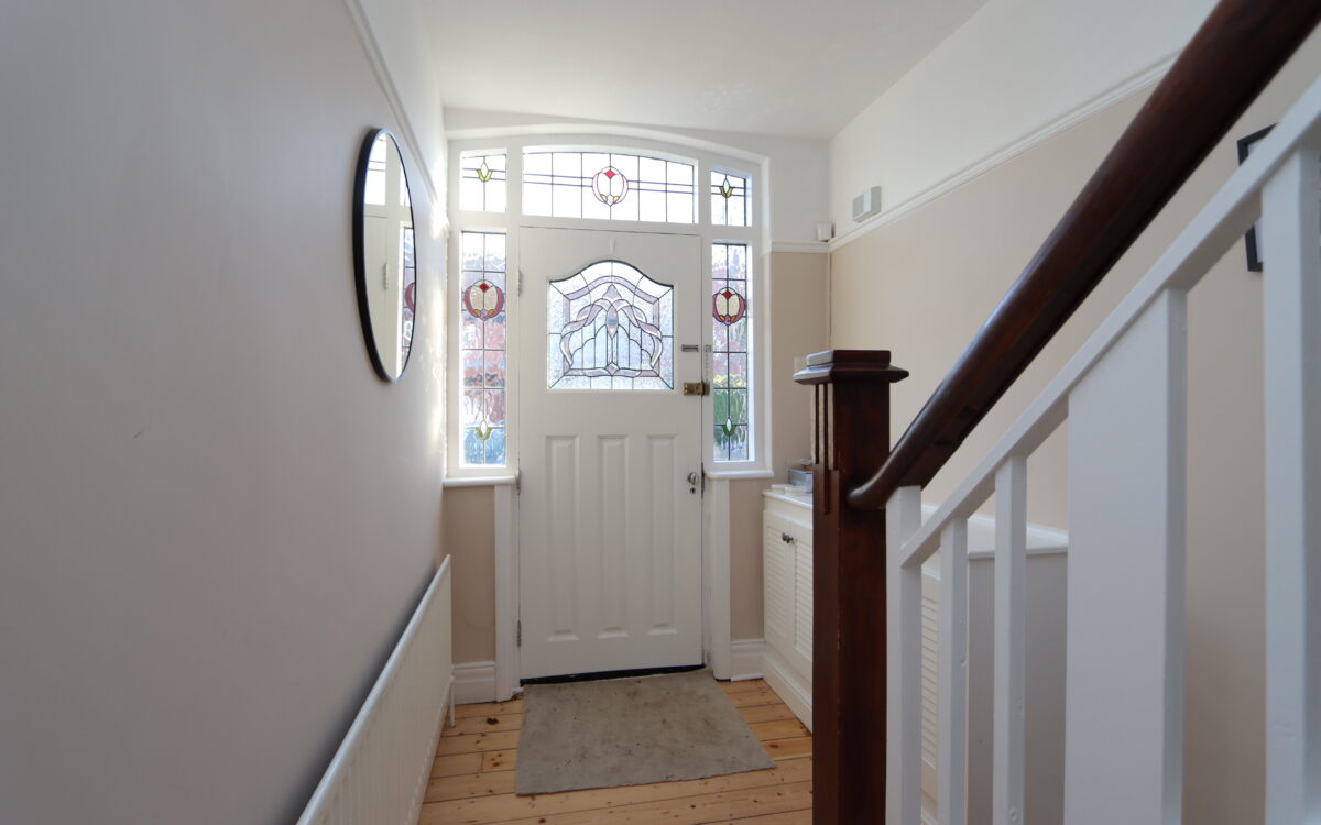 HALL: 16’ 6” x 5’ 11” (5.03m x 1.80m), accessed via glazed front door with windows above & to the side incorporating beautiful leaded & stained glass, spindle staircase to first floor, radiator, stripped & varnished original floorboards, fitted meter cupboard, picture rail and doors to downstairs WC and reception rooms.