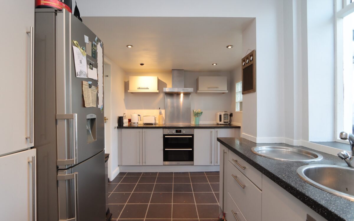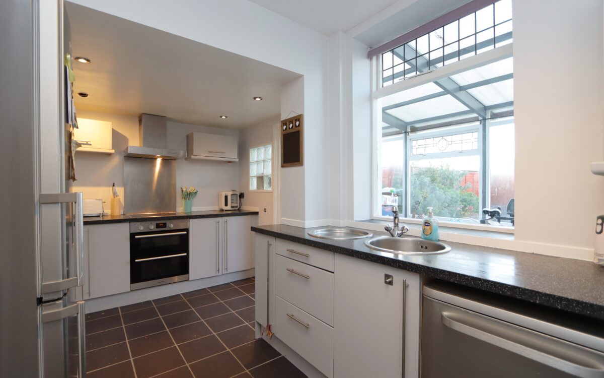 KITCHEN: 14’ 4” x 7’ 10” (4.37m x 2.39m), tiled floor, fitted wall & floor units, circular stainless steel sink & drainer with mixer tap, ‘AEG’ 4 ring electric hob with stainless steel splashback & illuminated extractor hood above, ‘Hotpoint’ oven, 4 concealed down lighters, doors to conservatory & garage, window and double banked radiator.