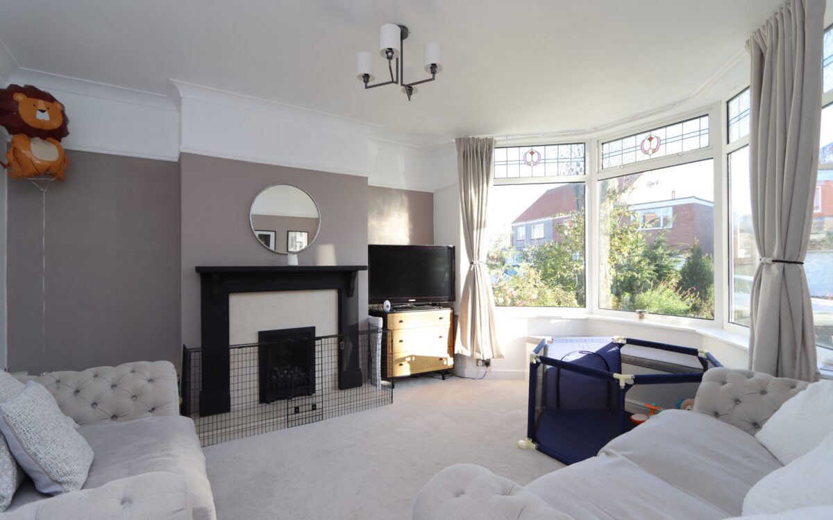 LOUNGE: 15’ 0” x 12’ 8” (4.57m x 3.86m) including uPVC double glazed bay window with seat and leaded & stained glass transoms, upright column style radiator, picture rail and traditional style fireplace with stone inset & hearth incorporating coal effect living flame gas fire.