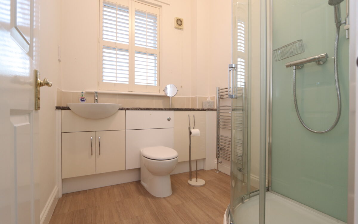 SHOWER ROOM: panelled corner shower cubicle with mixer shower, vanity unit with washbasin & low level WC with tiled splashback, extractor fan, stainless steel upright towel radiator, uPVC double glazed window with plantation shutters.