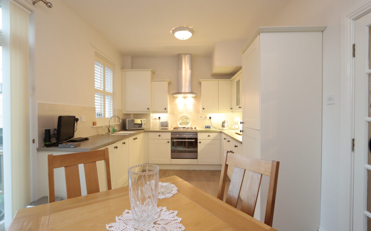 DINING KITCHEN: 15’ 7” x 9’ 7” (4.75m x 2.92m), fitted wall & floor units, illuminated work surfaces, part tiled walls, ‘Indesit’ 4 ring gas hob with illuminated stainless steel extractor hood above, ‘Indesit’ oven, 1 ½ Belfast sink, integrated ‘Belling’ dishwasher, integrated ‘Zanussi’ fridge/freezer, cupboard containing ‘Worcester’ gas fired combination boiler, double glazed Sash window with plantation shutters, and double glazed double opening doors overlooking and leading to the rear garden.