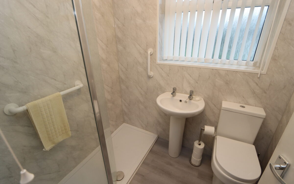 REFITTED SHOWER ROOM: Installed approx. 2023 with large walk-in shower cubicle – ‘Mira Sport’ shower, pedestal washbasin, low level WC, medicine cabinet, upright stainless steel towel radiator and uPVC double glazed window with vertical louvre blinds.
