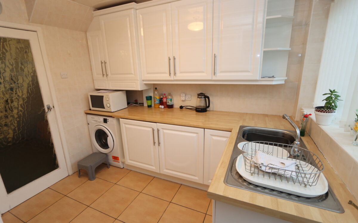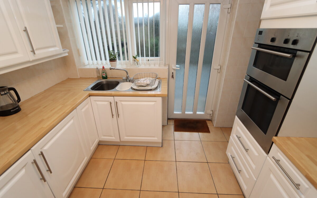 KITCHEN: at rear 9’5″ x 9’7″ (2.87m x 2.92m) with tiled floor and walls, fitted wall and floor units, ‘Franke’ 1½ bowl stainless steel sink, ‘Potterton Netaheat’ gas boiler, ‘John Lewis’ hob, ‘Siemens’ eye-level oven, integrated fridge freezer, ‘Hotpoint’ washing machine, uPVC double glazed window with vertical louvre blinds and uPVC double glazed door to rear garden.